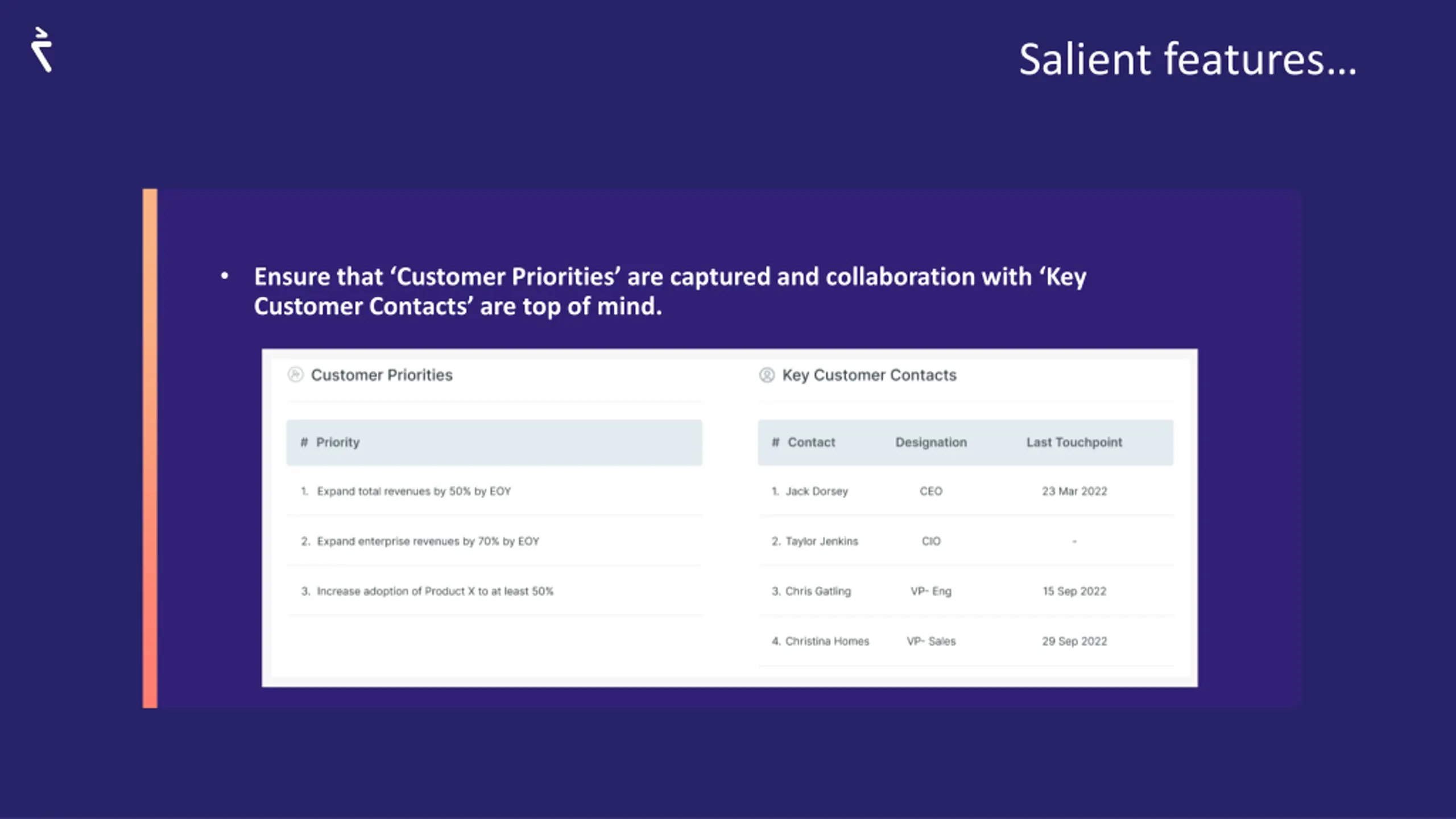 Salient features Ensure that Customer Priorities are captured and collaboration with Key Customer Contacts are top of mind.