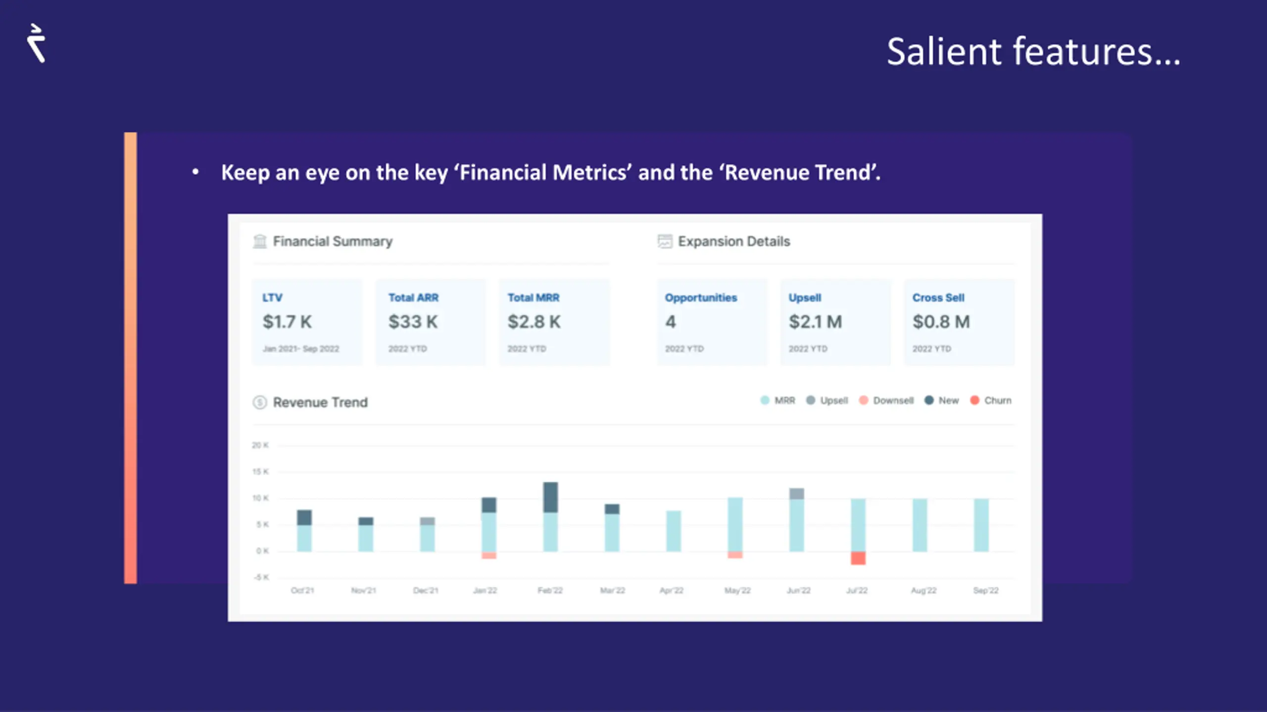 Salient features Keep an eye on the key Financial Metrics and the Revenue Trend .