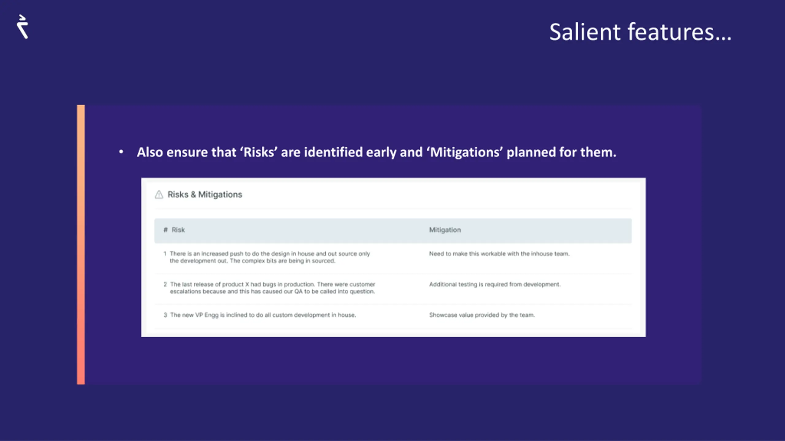 Salient features Also ensure that Risks are identified early and Mitigations planned for them.