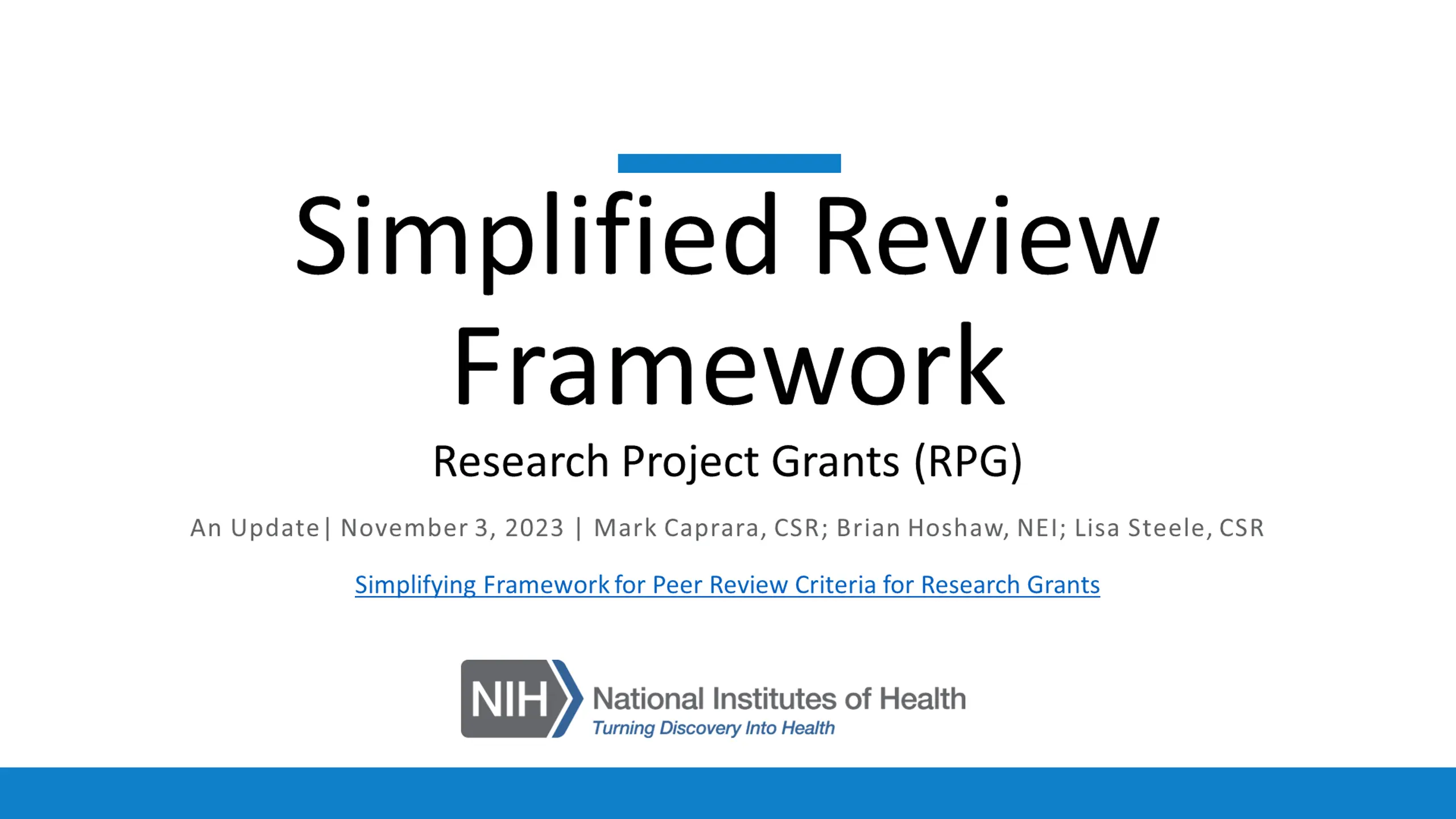 Simplified Review Framework Research Project Grants (RPG) An Update| November 3, 2023 | Mark Caprara, CSR; Brian Hoshaw, NEI; Lisa Steele, CSR Simplifying Framework for Peer Review Criteria for Research Grants