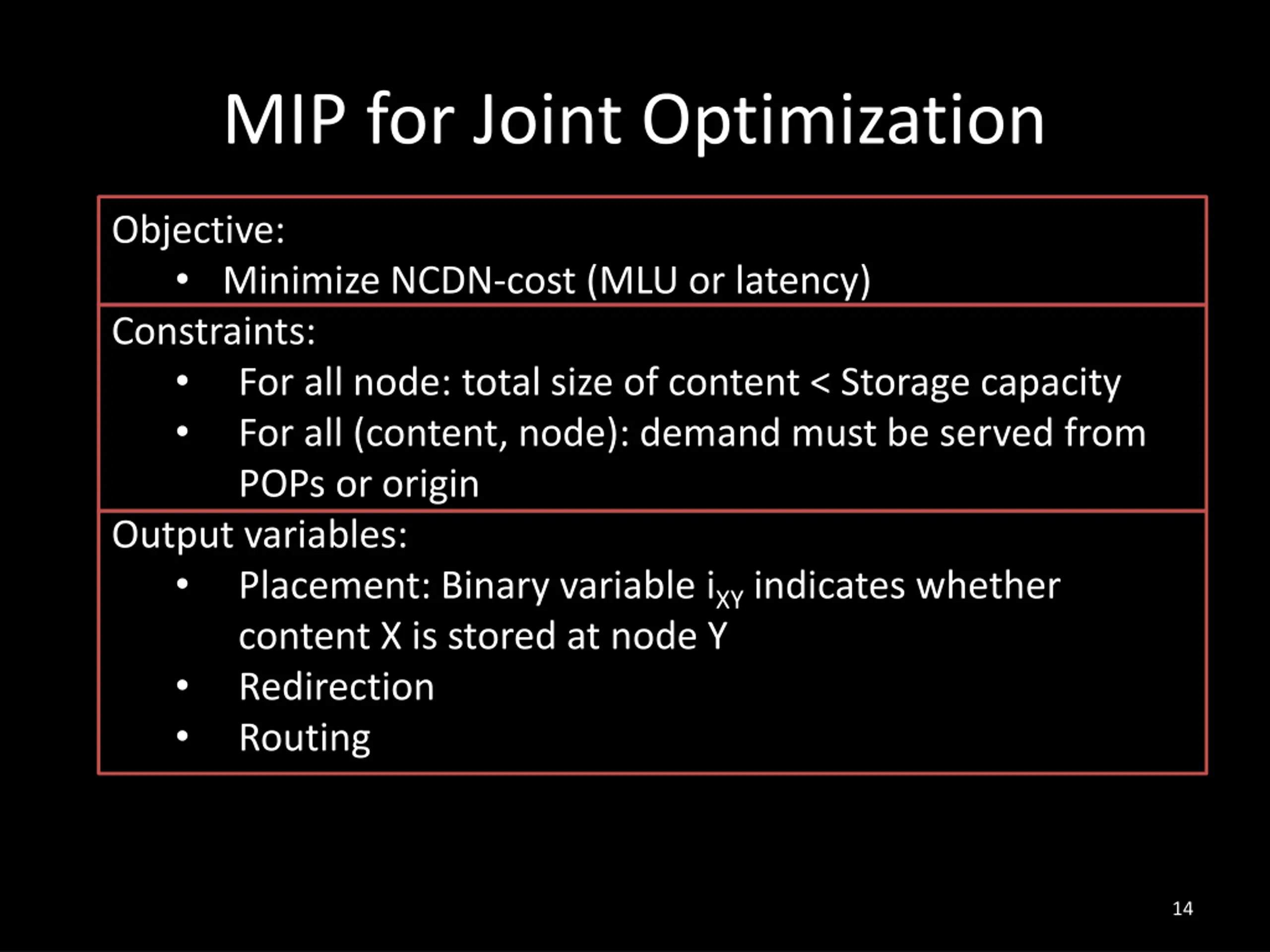 MIP for Joint Optimization Objective: Minimize NCDN-cost (MLU or latency) Constraints: For all node: total size of content < Storage capacity For all (content, node): demand must be served from POPs or origin Output variables: Placement: Binary variable iXY indicates whether content X is stored at node Y Redirection Routing 14
