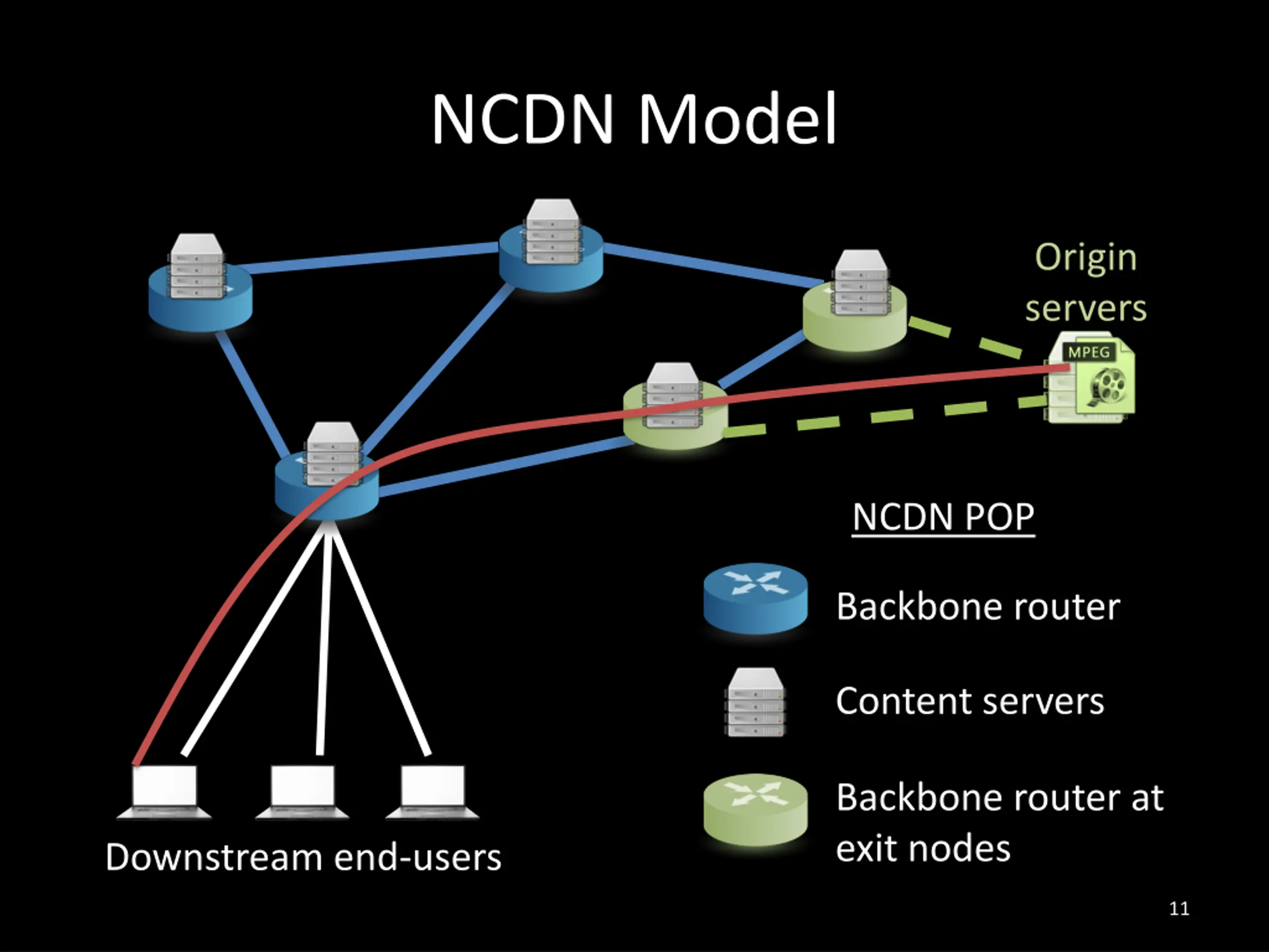 NCDN Model Origin servers NCDN POP Backbone router Content servers Backbone router at exit nodes Downstream end-users 10