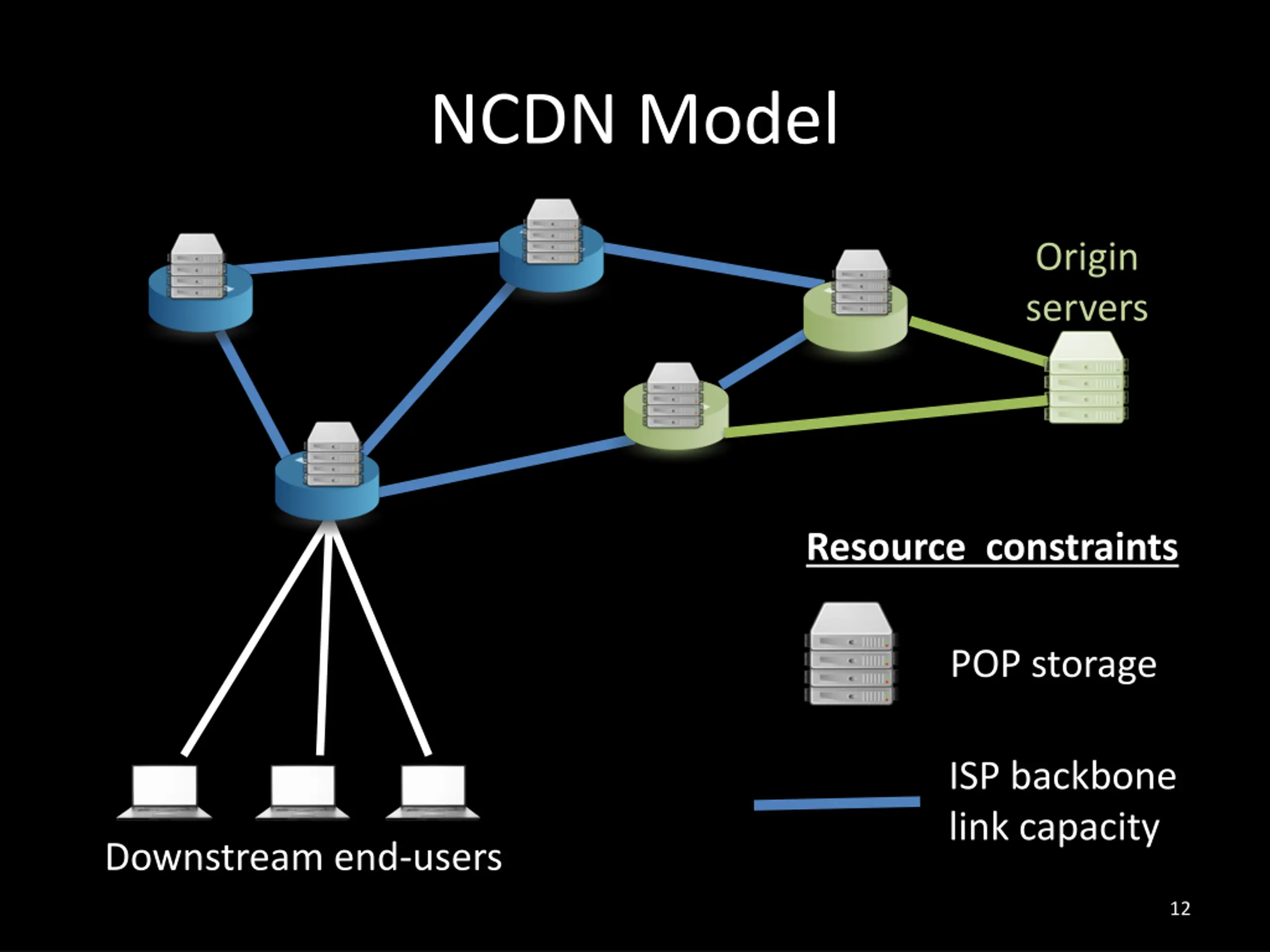 NCDN Model Origin servers NCDN POP Backbone router Content servers Backbone router at exit nodes Downstream end-users 11