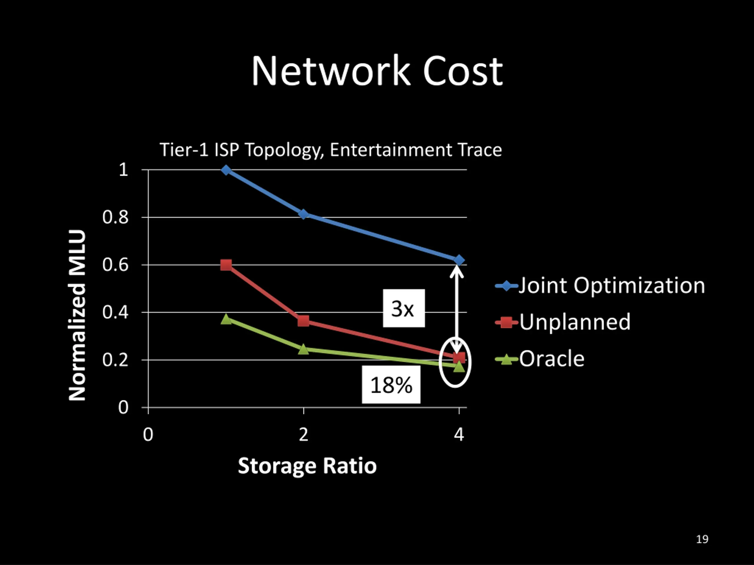 Network Cost Tier-1 ISP Topology, Entertainment Trace 1 0.8 Normalized MLU 0.6 Joint Optimization Unplanned Oracle 3x 0.4 0.2 18% 0 0 2 4 Storage Ratio 19