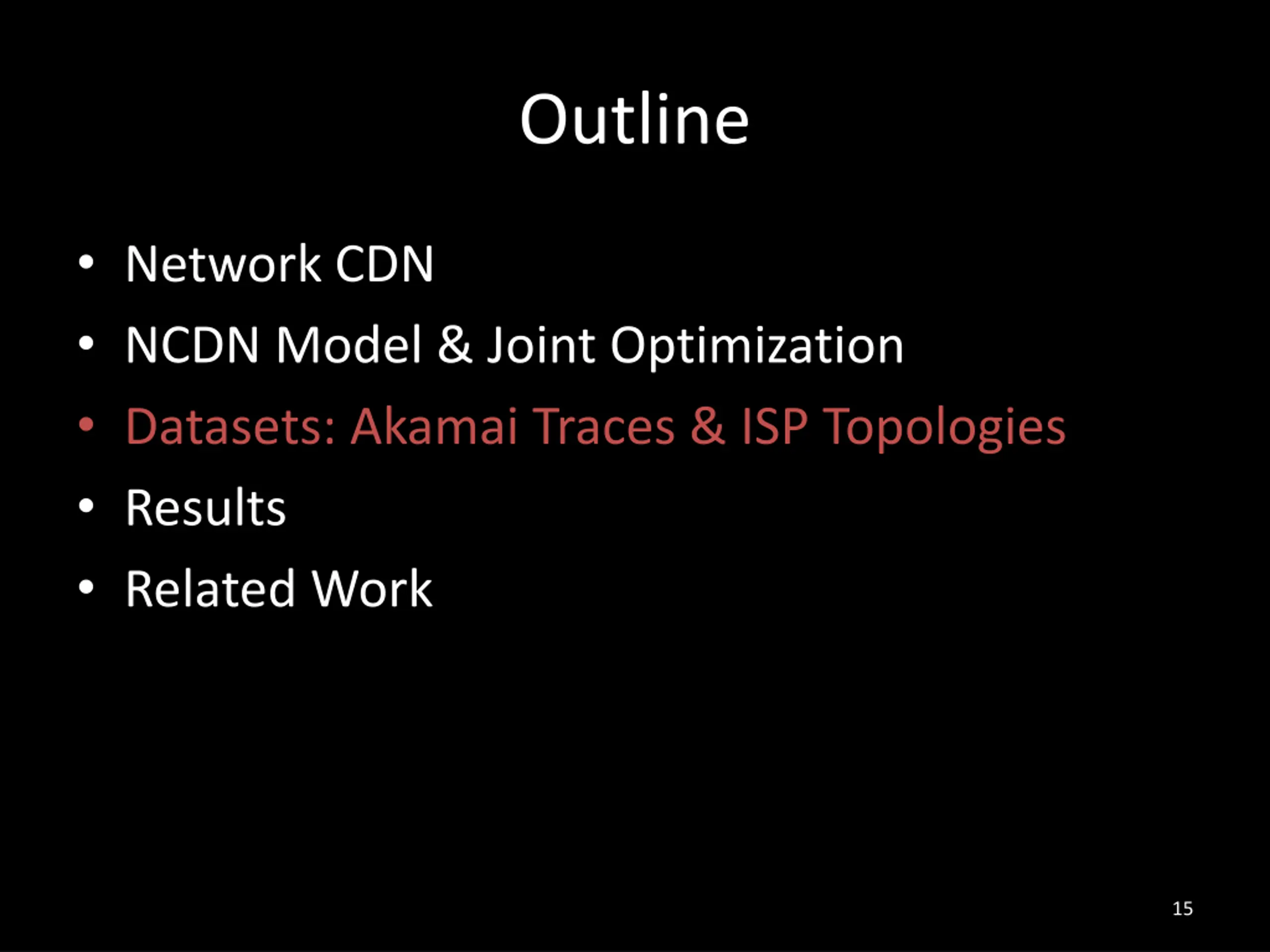 Outline Network CDN NCDN Model & Joint Optimization Datasets: Akamai Traces & ISP Topologies Results Related Work 15