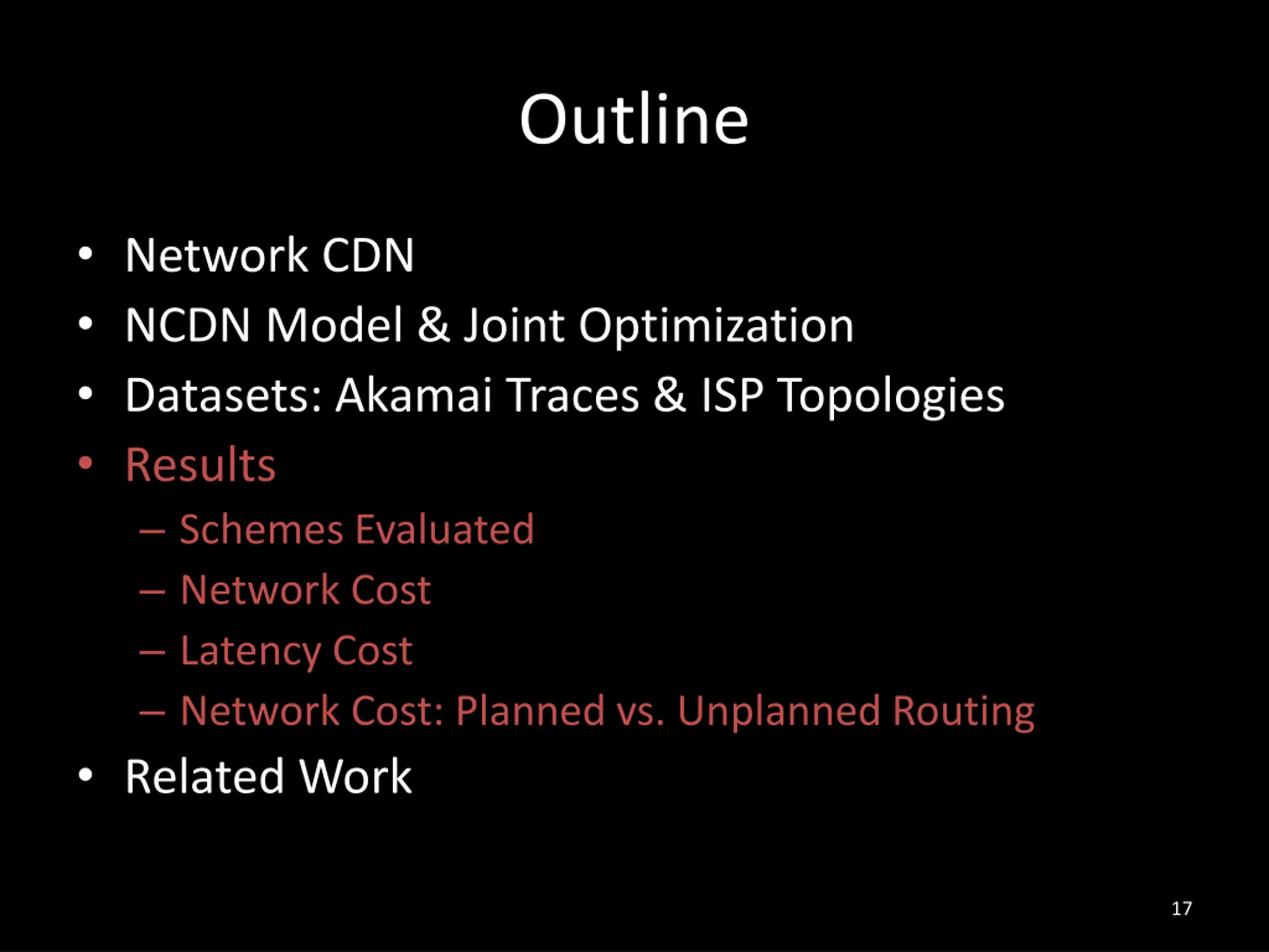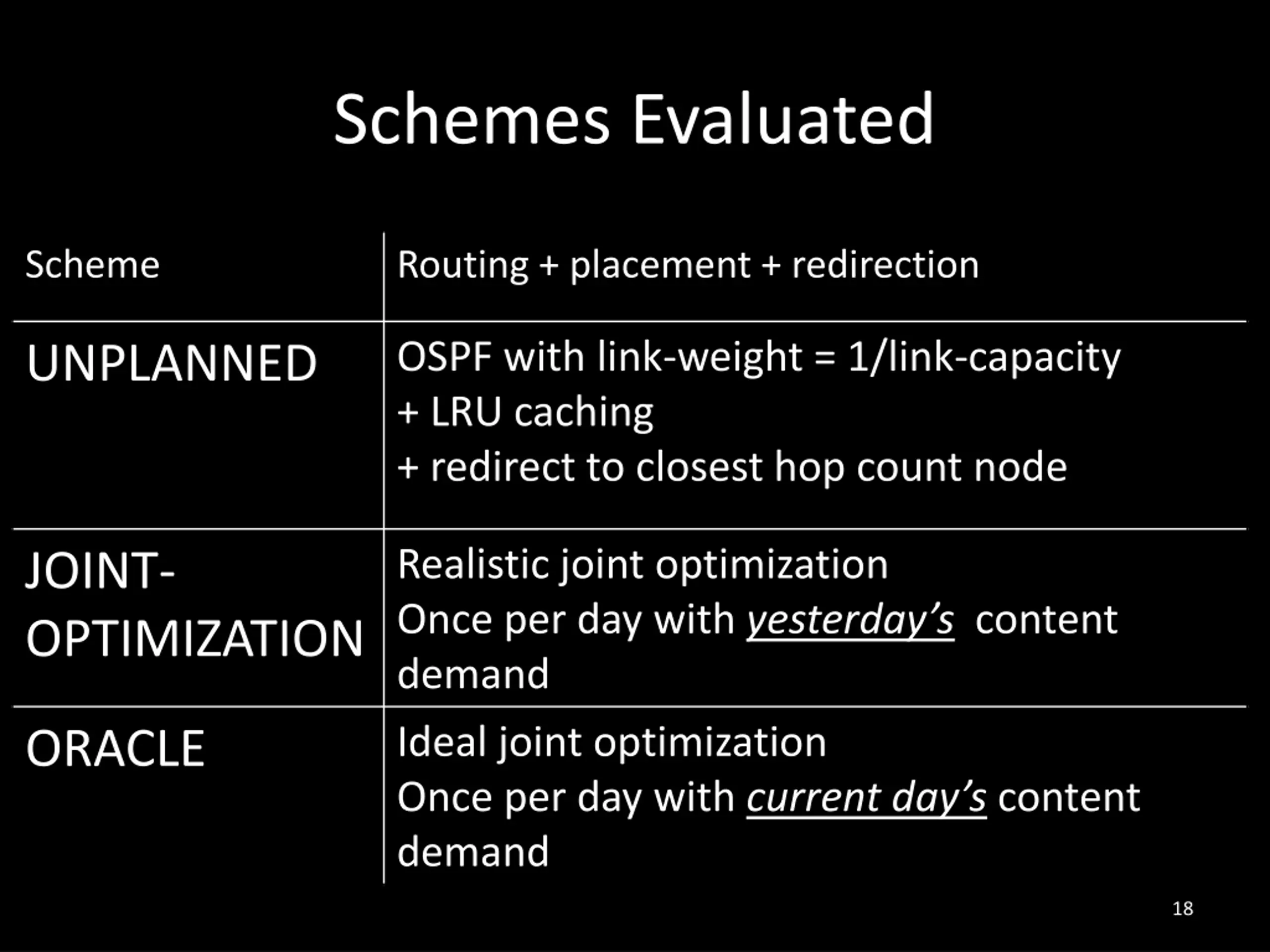 Outline Network CDN NCDN Model & Joint Optimization Datasets: Akamai Traces & ISP Topologies Results Schemes Evaluated Network Cost Latency Cost Network Cost: Planned vs. Unplanned Routing Related Work 17