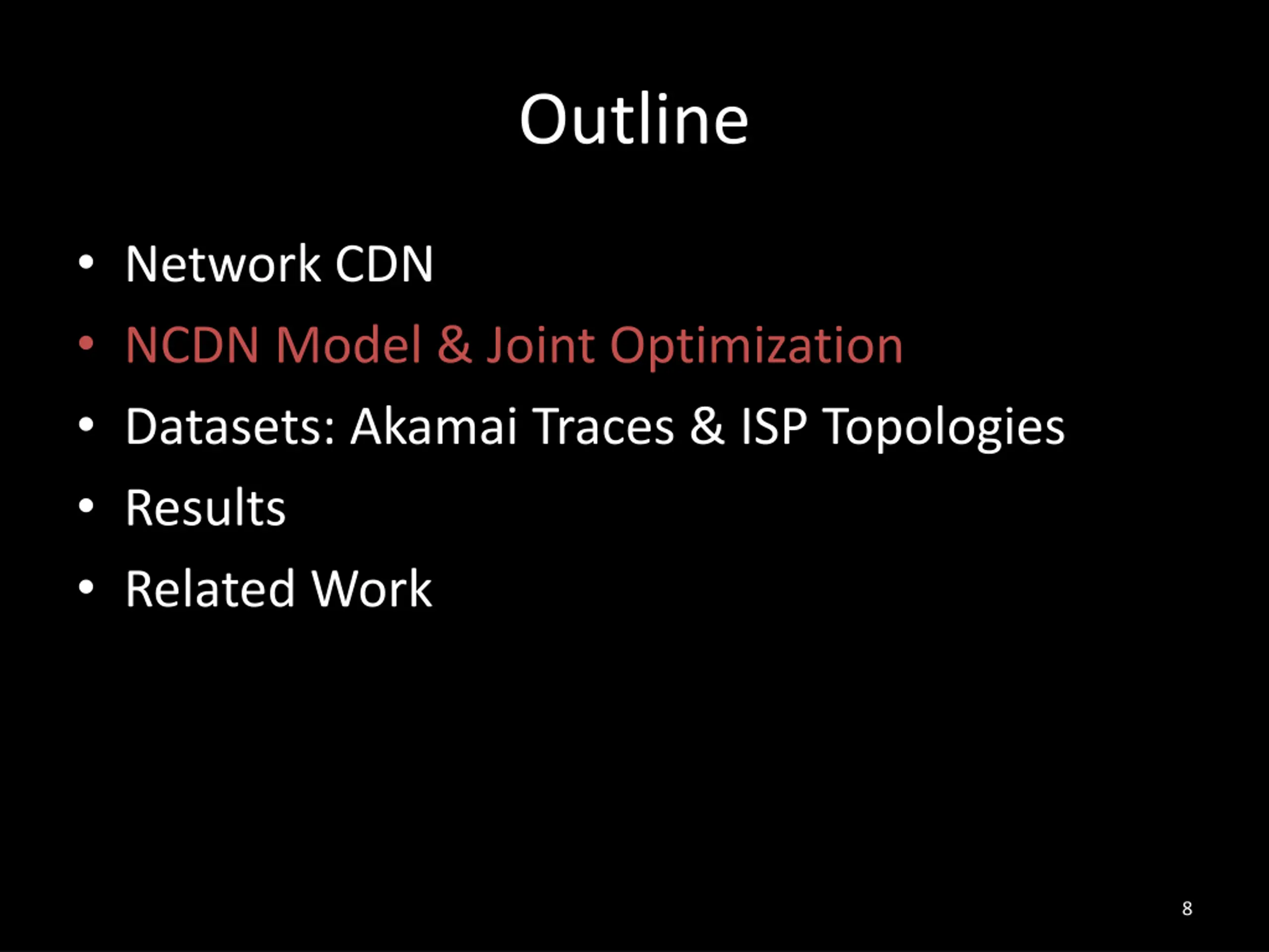 Outline Network CDN NCDN Model & Joint Optimization Datasets: Akamai Traces & ISP Topologies Results Related Work 8