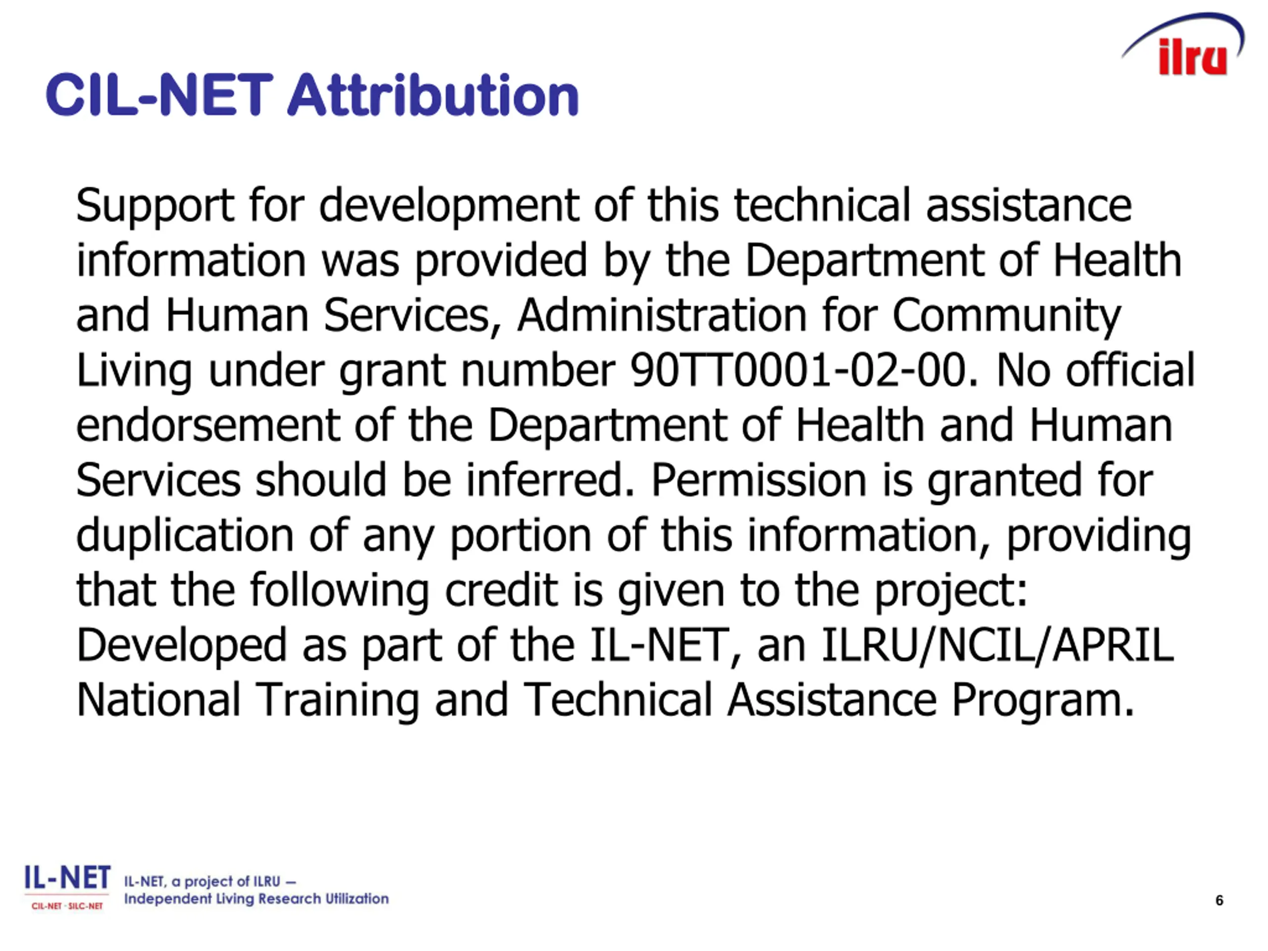 CIL CIL- -NET NET Attribution Attribution Support for development of this technical assistance information was provided by the Department of Health and Human Services, Administration for Community Living under grant number 90TT0001-02-00. No official endorsement of the Department of Health and Human Services should be inferred. Permission is granted for duplication of any portion of this information, providing that the following credit is given to the project: Developed as part of the IL-NET, an ILRU/NCIL/APRIL National Training and Technical Assistance Program. 6