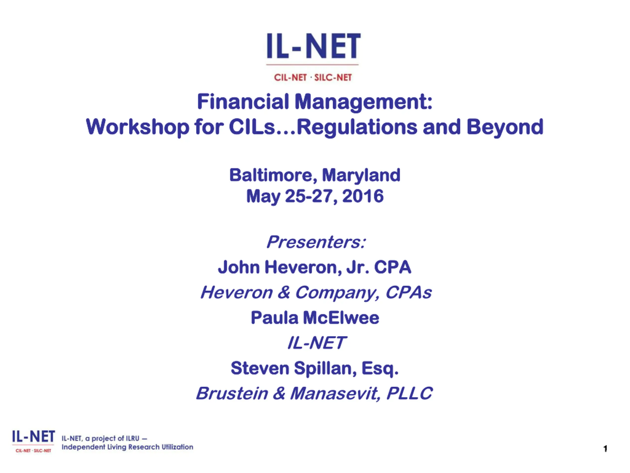 Financial Management: Financial Management: Workshop for CILs Regulations and for CILs Regulations and Beyond Workshop Beyond Baltimore, Baltimore, Maryland May 25 May 25- -27, 2016 27, 2016 Maryland Presenters: John Heveron, Jr. CPA John Heveron, Jr. CPA Heveron & Company, CPAs Paula Paula McElwee McElwee IL-NET Steven Spillan, Esq. Steven Spillan, Esq. Brustein & Manasevit, PLLC 11