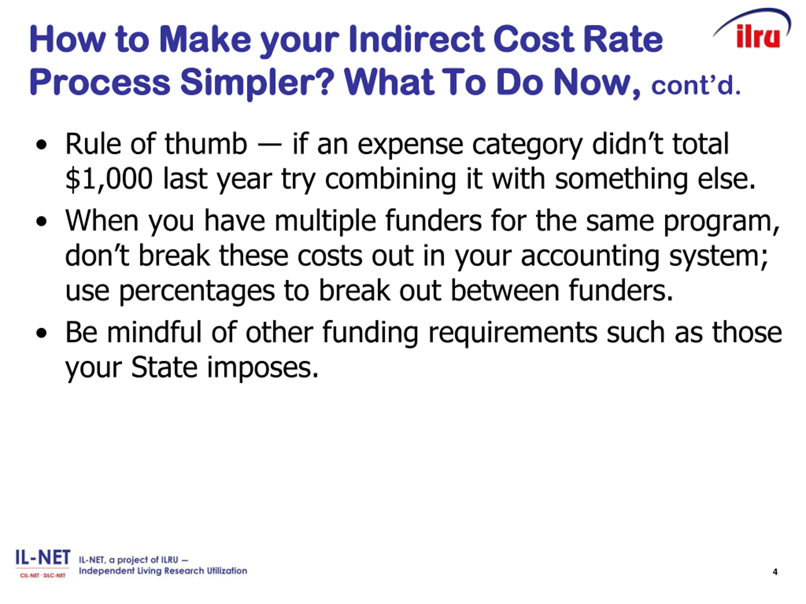 How to Make your Indirect Cost Rate How to Make your Indirect Cost Rate Process Simpler? What To Do Now Process Simpler? What To Do Now The level of detail in your Indirect Cost Rate Proposal should be based on and be similar to the level of detail in your statement of functional expenses if you issue financial statements, or to your Form 990 if you issue a full form 990 rather than a Form 990 EZ. Simplify your record-keeping and your vouchering by using fewer categories and putting more (small) items into indirect. 3