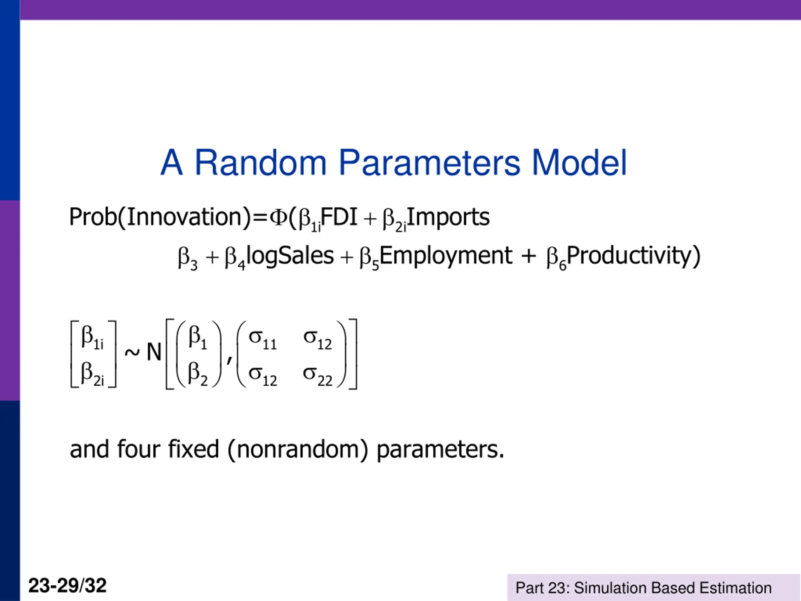 A Random Parameters Model + Employment + Productivity) Prob(Innovation)= ( FDI Imports 1i 2i + 3 + logSales 4 5 6 1i 1 11 12 ~ N , 2i 2 12 22 and four fixed (nonrandom) parameters. 23-29/32 Part 23: Simulation Based Estimation