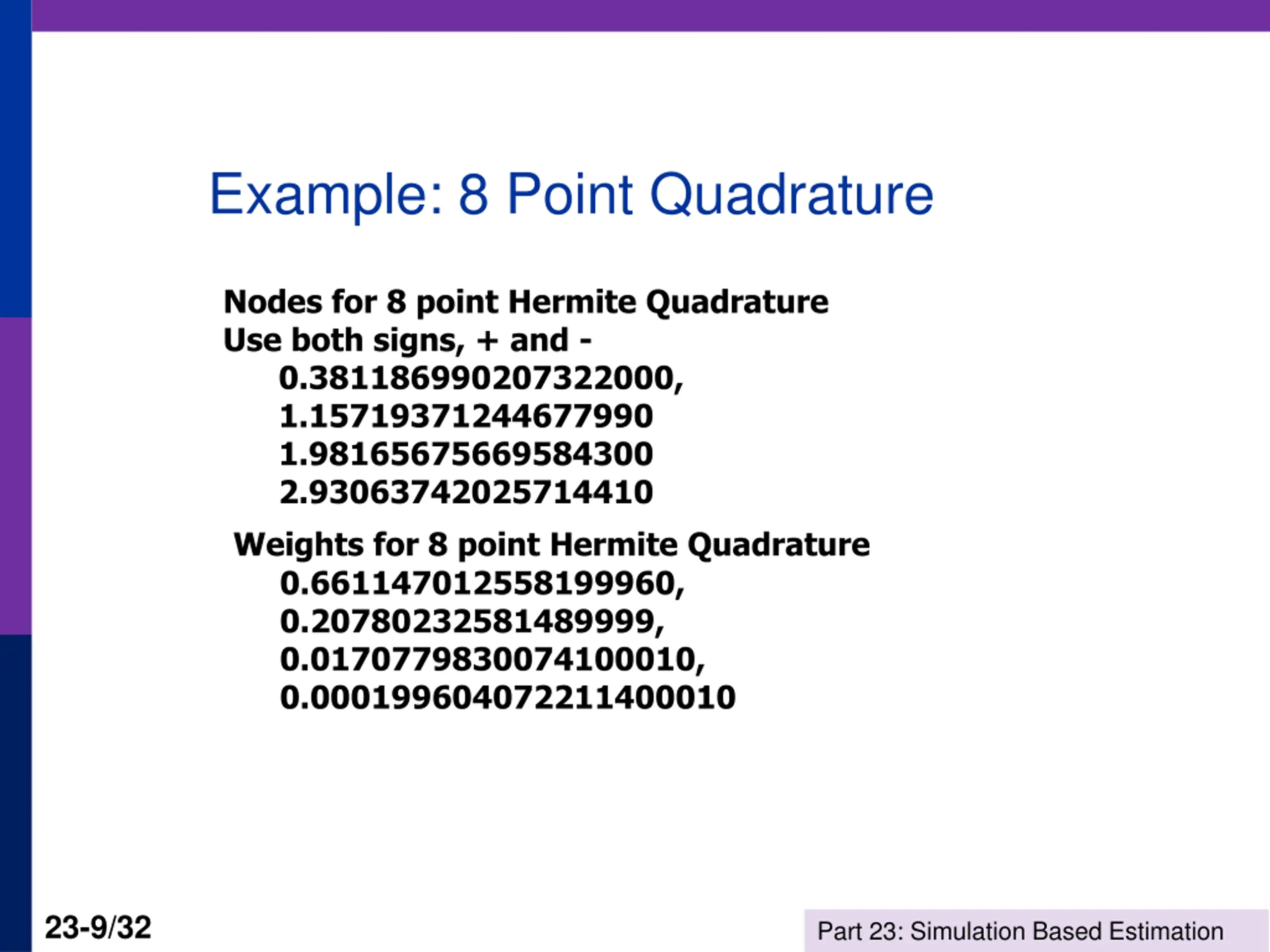 Example: 8 Point Quadrature Nodes for 8 point Hermite Quadrature Use both signs, + and - 0.381186990207322000, 1.15719371244677990 1.98165675669584300 2.93063742025714410 Weights for 8 point Hermite Quadrature 0.661147012558199960, 0.20780232581489999, 0.0170779830074100010, 0.000199604072211400010 23-9/32 Part 23: Simulation Based Estimation