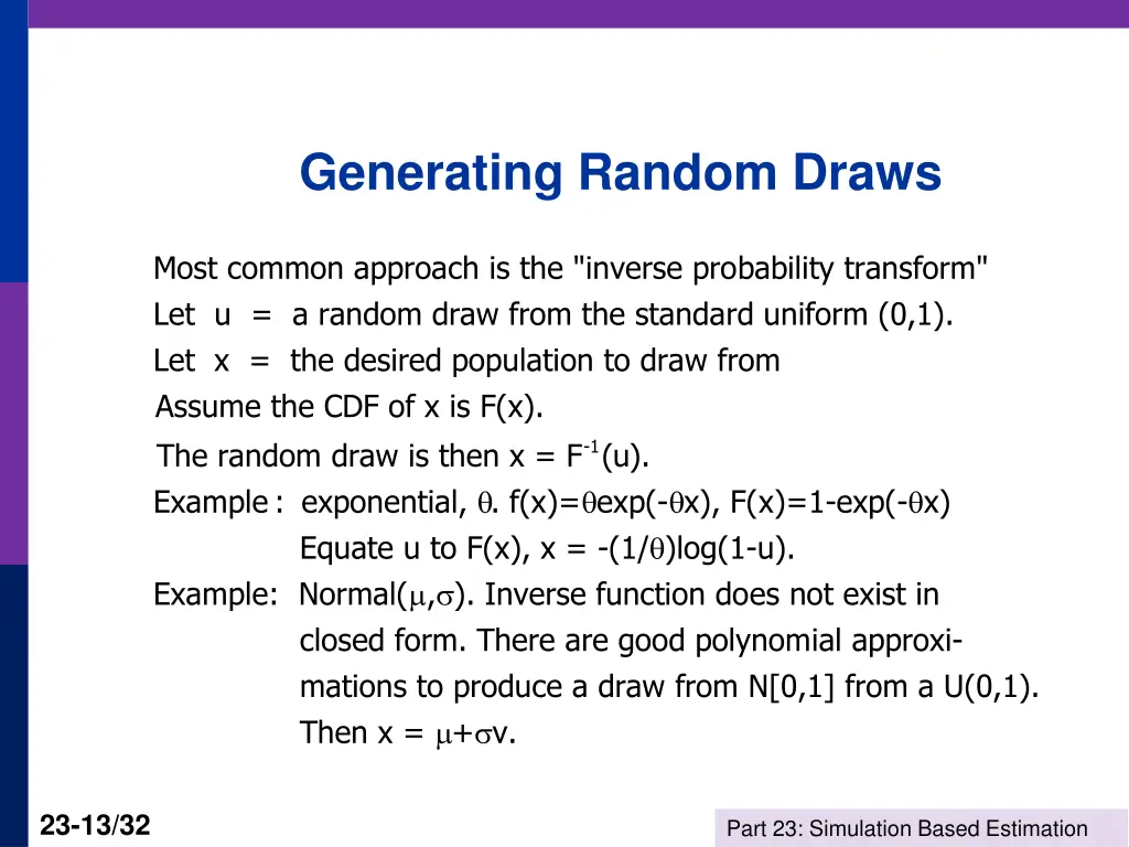 Generating Random Draws Most common approach is the "inverse probability transform" Let u = a random draw from the standard uniform (0,1). Let x = the desired population to draw from Assume the CDF of x is F(x). The random Example: exponential, . f(x)= exp(- x), F(x)=1-exp(- x) Equate u to F(x), x = -(1/ )log(1-u). Example: Normal( , ). Inverse function does not exist in closed form. There are good polynomial approxi- mations to produce a draw from N[0,1] from a U(0,1). Then x = + v. -1 draw is then x = F (u). 23-13/32 Part 23: Simulation Based Estimation