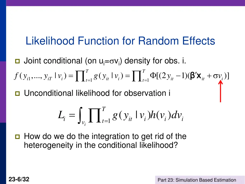 Likelihood Function for Random Effects Joint conditional (on ui= vi) density for obs. i. ( ,..., | ) ( = i iT i t f y y v g y T T x x = = + | ) v [(2 1)( )] y v 1 it i it it i = 1 1 t Unconditional likelihood for observation i = T 1( g y = | ) ( ) i v h v dv L i it i i t v i How do we do the integration to get rid of the heterogeneity in the conditional likelihood? 23-6/32 Part 23: Simulation Based Estimation