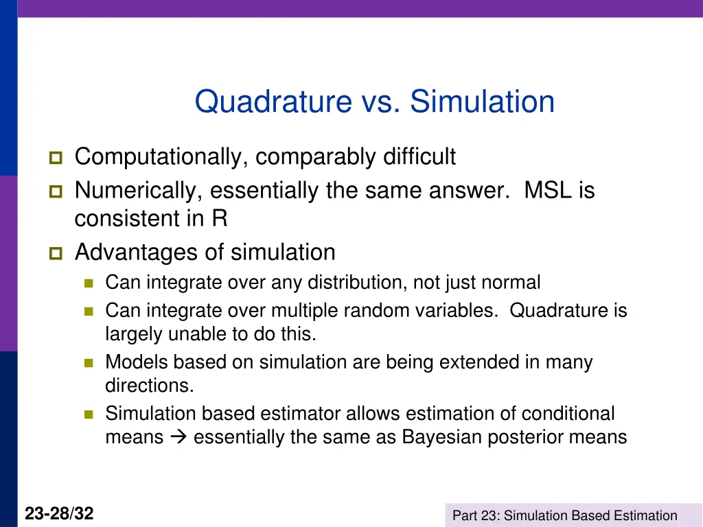 Quadrature vs. Simulation Computationally, comparably difficult Numerically, essentially the same answer. MSL is consistent in R Advantages of simulation Can integrate over any distribution, not just normal Can integrate over multiple random variables. Quadrature is largely unable to do this. Models based on simulation are being extended in many directions. Simulation based estimator allows estimation of conditional means essentially the same as Bayesian posterior means 23-28/32 Part 23: Simulation Based Estimation