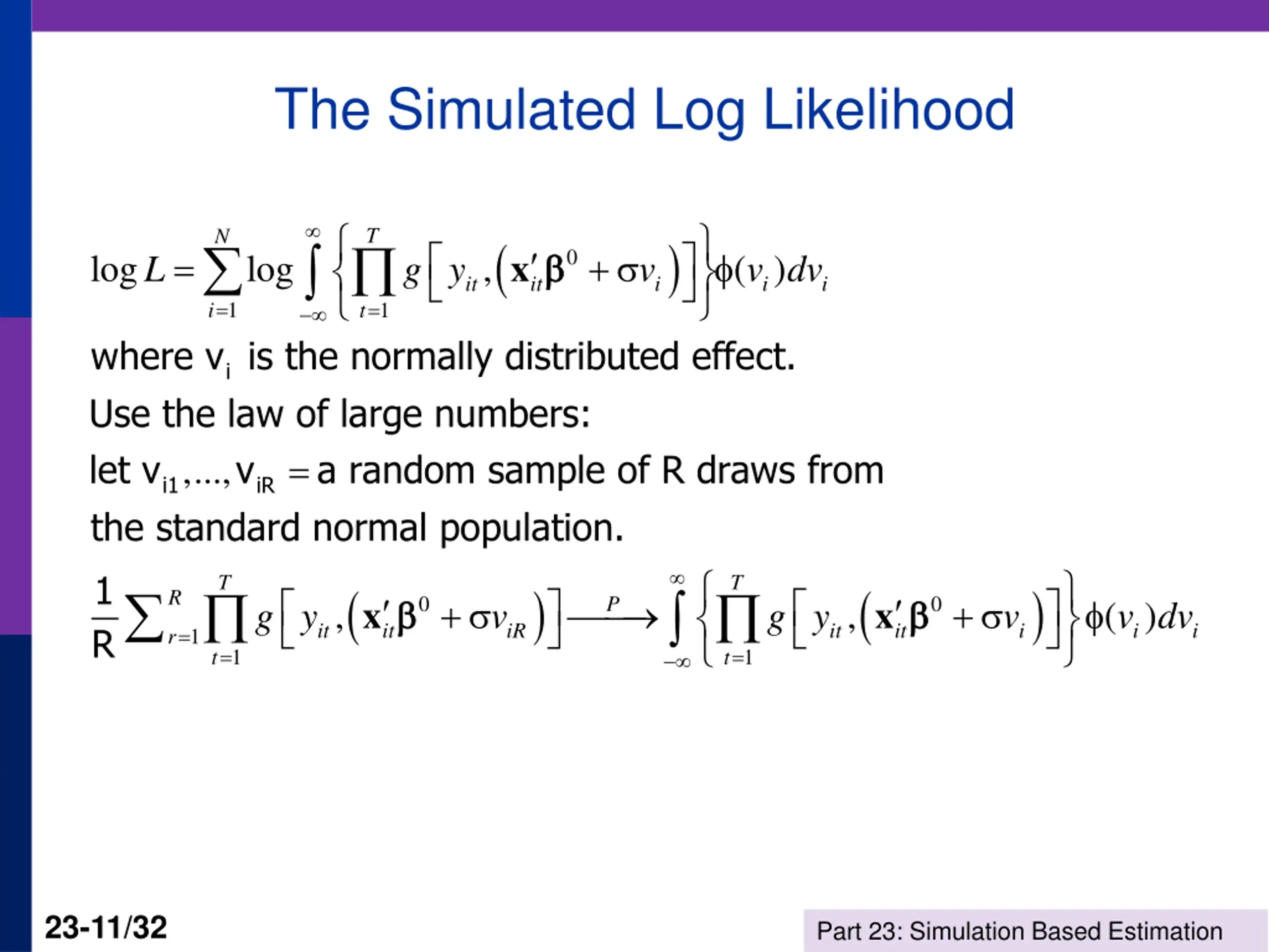 n = log ( , ) L log = 1 i T x x 0 + + + + )] ( ) ( 0 it 1 it 2 it [(2 1)( ( ) ( ) ) y v x v x v v dv dv 1 1 1 2 2 2 2 1 2 1 it i i i i i i = 1 t 2 = 1+ Simulated 2 1 R T n R log ( , ) L log ( ) G v v 1, i r i 2, r = = = 1 1 i r 1 t (v v = rth draw from standard normal for individual i and variable k. ,...,v ,...) are reused for all computations of function or derivatives. ik,r i1,r i1,R 23-30/32 Part 23: Simulation Based Estimation