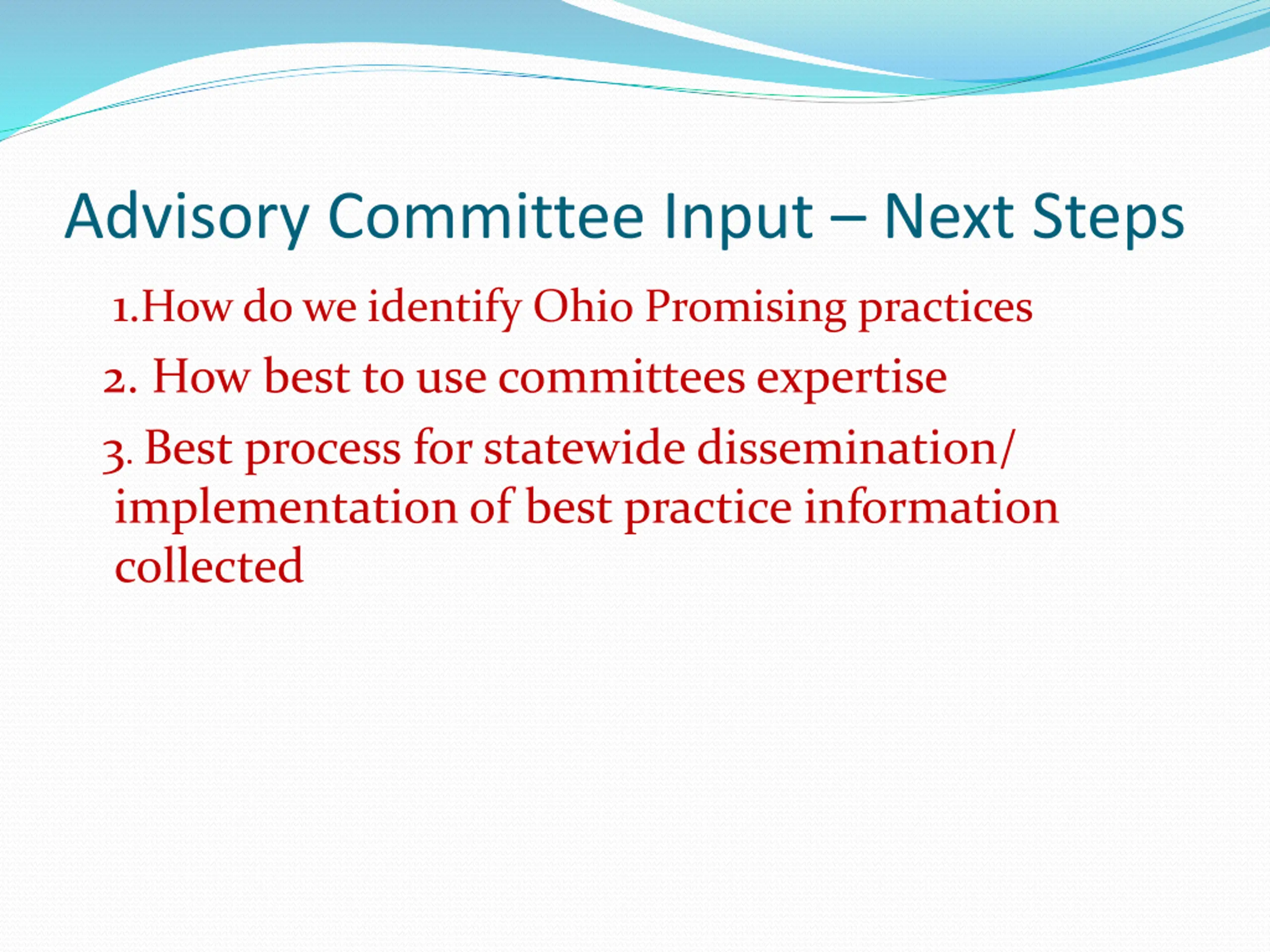 Advisory Committee Input Next Steps 1.How do we identify Ohio Promising practices 2. How best to use committees expertise 3. Best process for statewide dissemination/ implementation of best practice information collected