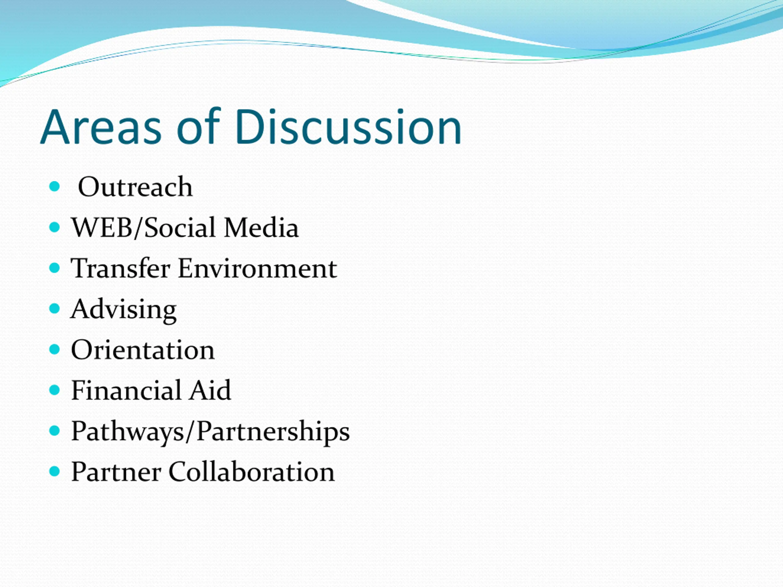 Areas of Discussion Outreach WEB/Social Media Transfer Environment Advising Orientation Financial Aid Pathways/Partnerships Partner Collaboration
