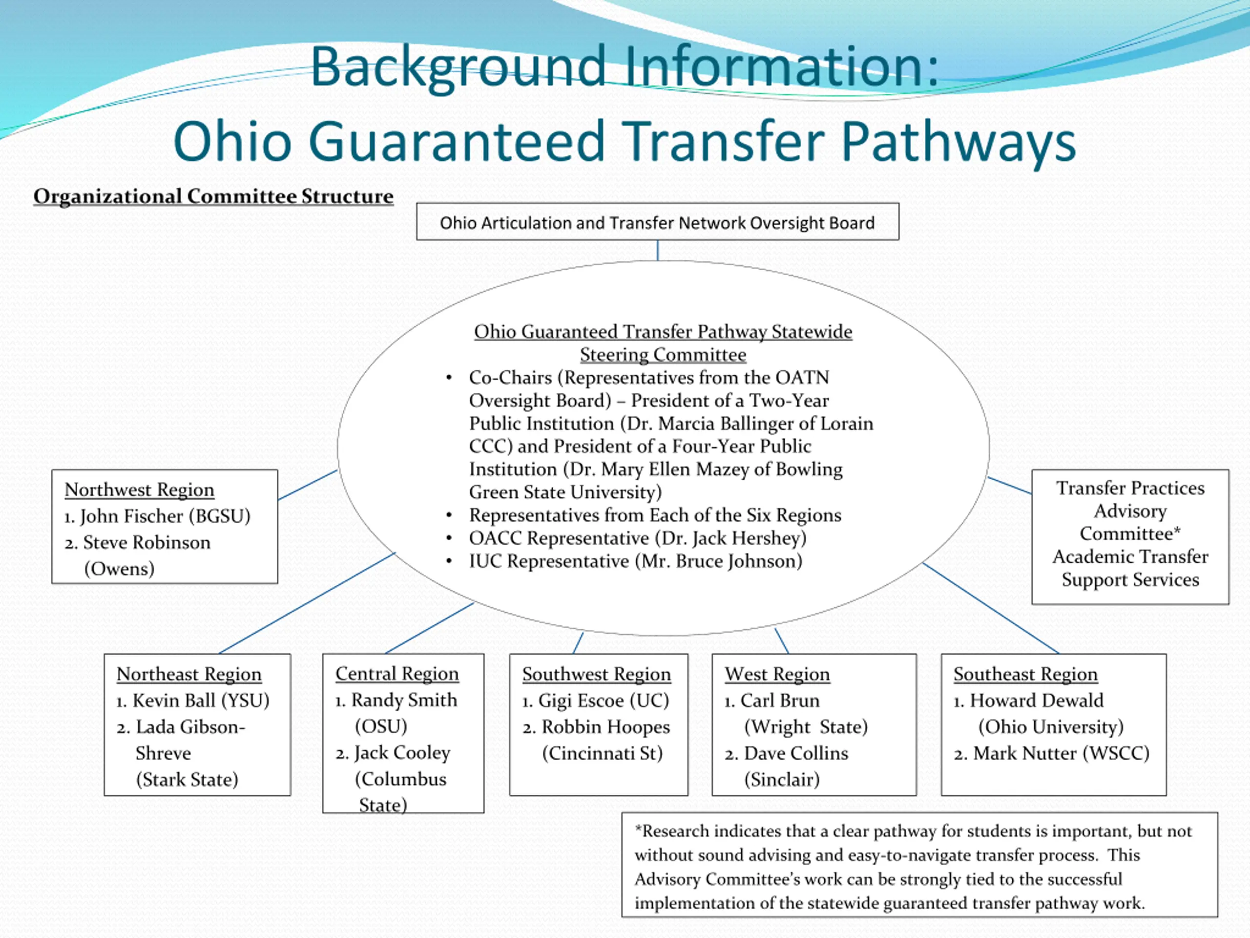 Background Information: Ohio Guaranteed Transfer Pathways Organizational Committee Structure Ohio Articulation and Transfer Network Oversight Board Ohio Guaranteed Transfer Pathway Statewide Steering Committee Co-Chairs (Representatives from the OATN Oversight Board) President of a Two-Year Public Institution (Dr. Marcia Ballinger of Lorain CCC) and President of a Four-Year Public Institution (Dr. Mary Ellen Mazey of Bowling Green State University) Representatives from Each of the Six Regions OACC Representative (Dr. Jack Hershey) IUC Representative (Mr. Bruce Johnson) Transfer Practices Advisory Committee* Academic Transfer Support Services Northwest Region 1. John Fischer (BGSU) 2. Steve Robinson (Owens) Central Region 1. Randy Smith (OSU) 2. Jack Cooley (Columbus State) Northeast Region 1. Kevin Ball (YSU) 2. Lada Gibson- Shreve (Stark State) Southwest Region 1. Gigi Escoe (UC) 2. Robbin Hoopes (Cincinnati St) West Region 1. Carl Brun (Wright State) 2. Dave Collins (Sinclair) Southeast Region 1. Howard Dewald (Ohio University) 2. Mark Nutter (WSCC) *Research indicates that a clear pathway for students is important, but not without sound advising and easy-to-navigate transfer process. This Advisory Committee s work can be strongly tied to the successful implementation of the statewide guaranteed transfer pathway work.