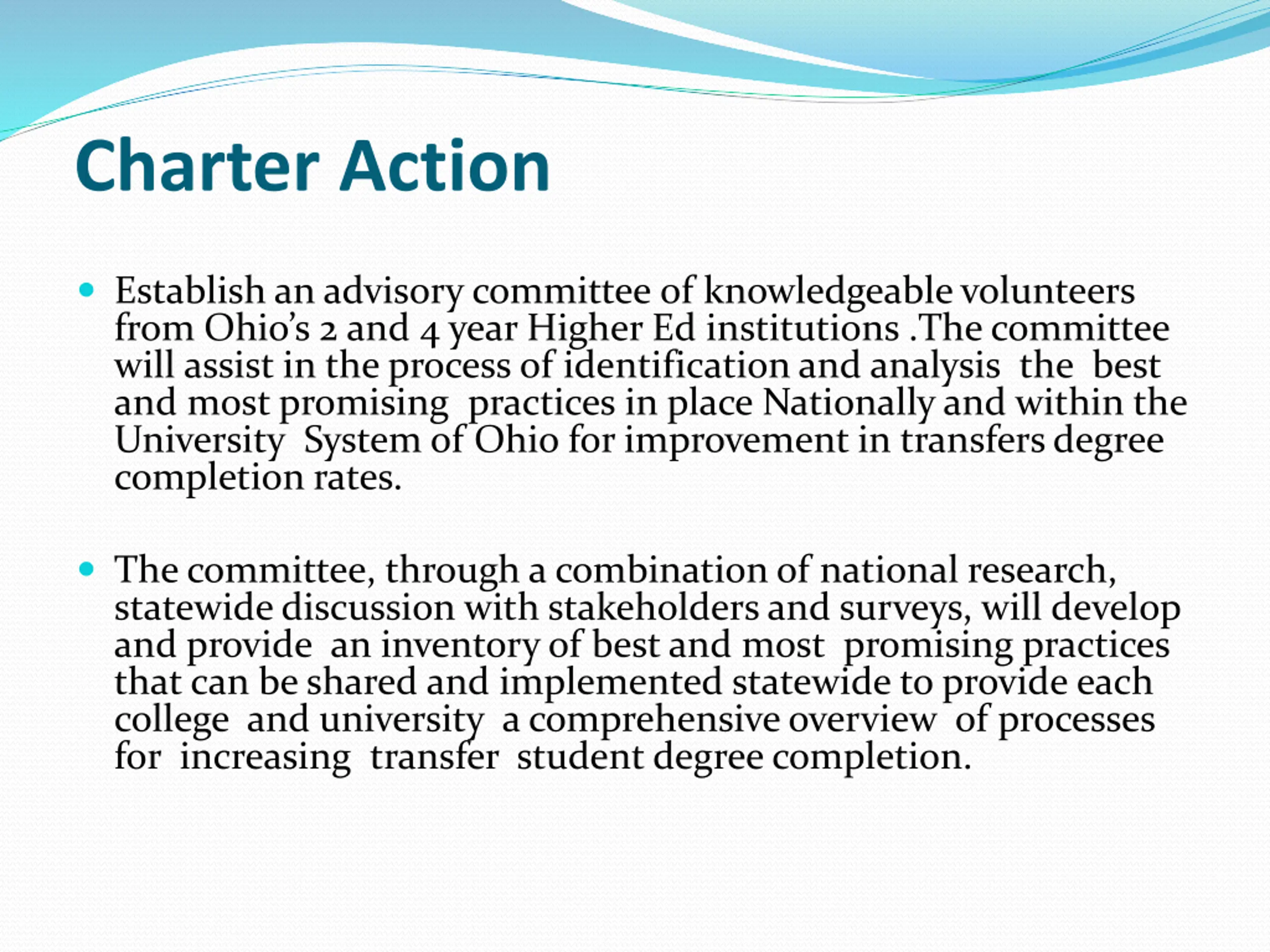 Charter Action Establish an advisory committee 0f knowledgeable volunteers from Ohio s 2 and 4 year Higher Ed institutions .The committee will assist in the process of identification and analysis the best and most promising practices in place Nationally and within the University System of Ohio for improvement in transfers degree completion rates. The committee, through a combination of national research, statewide discussion with stakeholders and surveys, will develop and provide an inventory of best and most promising practices that can be shared and implemented statewide to provide each college and university a comprehensive overview of processes for increasing transfer student degree completion.