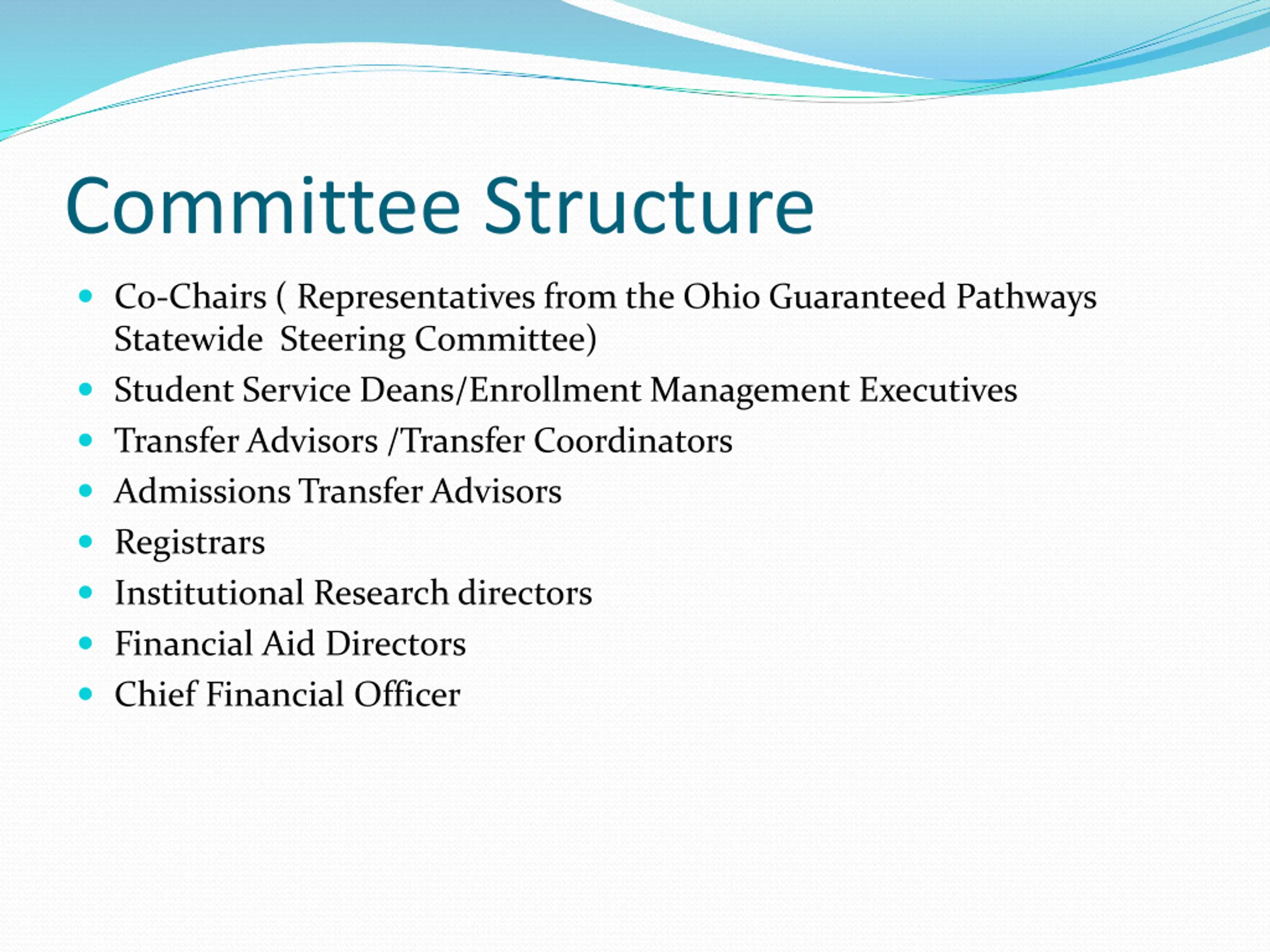 Committee Structure Co-Chairs ( Representatives from the Ohio Guaranteed Pathways Statewide Steering Committee) Student Service Deans/Enrollment Management Executives Transfer Advisors /Transfer Coordinators Admissions Transfer Advisors Registrars Institutional Research directors Financial Aid Directors Chief Financial Officer