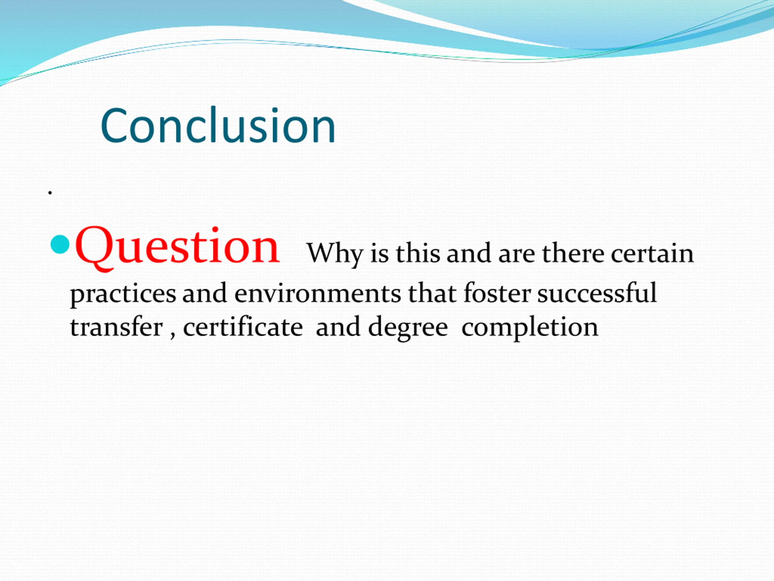 Conclusion . Question Why is this and are there certain practices and environments that foster successful transfer , certificate and degree completion