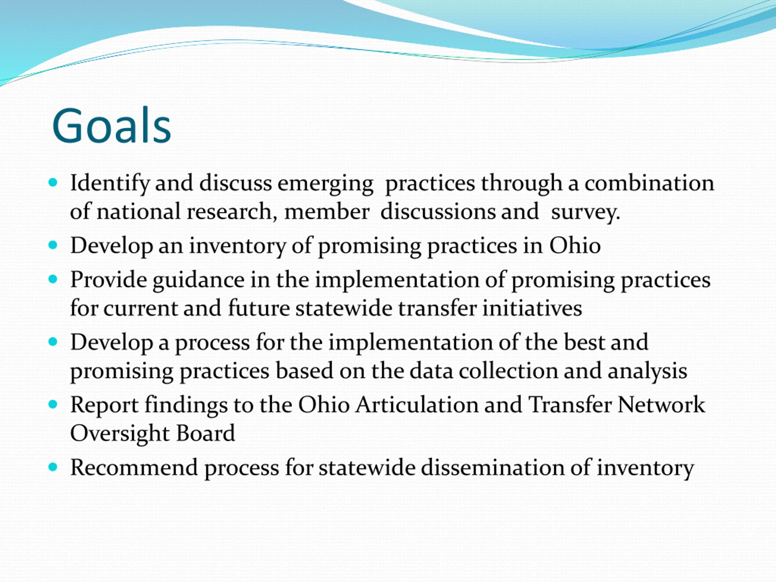 Goals Identify and discuss emerging practices through a combination of national research, member discussions and survey. Develop an inventory of promising practices in Ohio Provide guidance in the implementation of promising practices for current and future statewide transfer initiatives Develop a process for the implementation of the best and promising practices based on the data collection and analysis Report findings to the Ohio Articulation and Transfer Network Oversight Board Recommend process for statewide dissemination of inventory