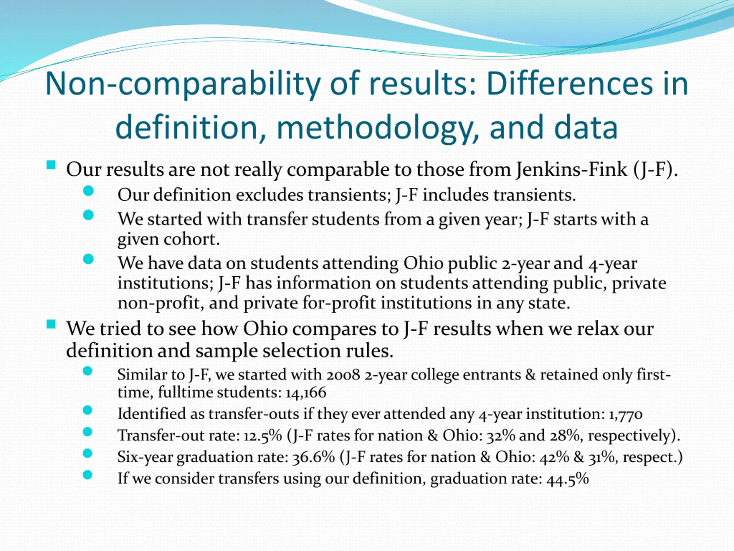 Non-comparability of results: Differences in definition, methodology, and data Our results are not really comparable to those from Jenkins-Fink (J-F). Our definition excludes transients; J-F includes transients. We started with transfer students from a given year; J-F starts with a given cohort. We have data on students attending Ohio public 2-year and 4-year institutions; J-F has information on students attending public, private non-profit, and private for-profit institutions in any state. We tried to see how Ohio compares to J-F results when we relax our definition and sample selection rules. Similar to J-F, we started with 2008 2-year college entrants & retained only first- time, fulltime students: 14,166 Identified as transfer-outs if they ever attended any 4-year institution: 1,770 Transfer-out rate: 12.5% (J-F rates for nation & Ohio: 32% and 28%, respectively). Six-year graduation rate: 36.6% (J-F rates for nation & Ohio: 42% & 31%, respect.) If we consider transfers using our definition, graduation rate: 44.5%