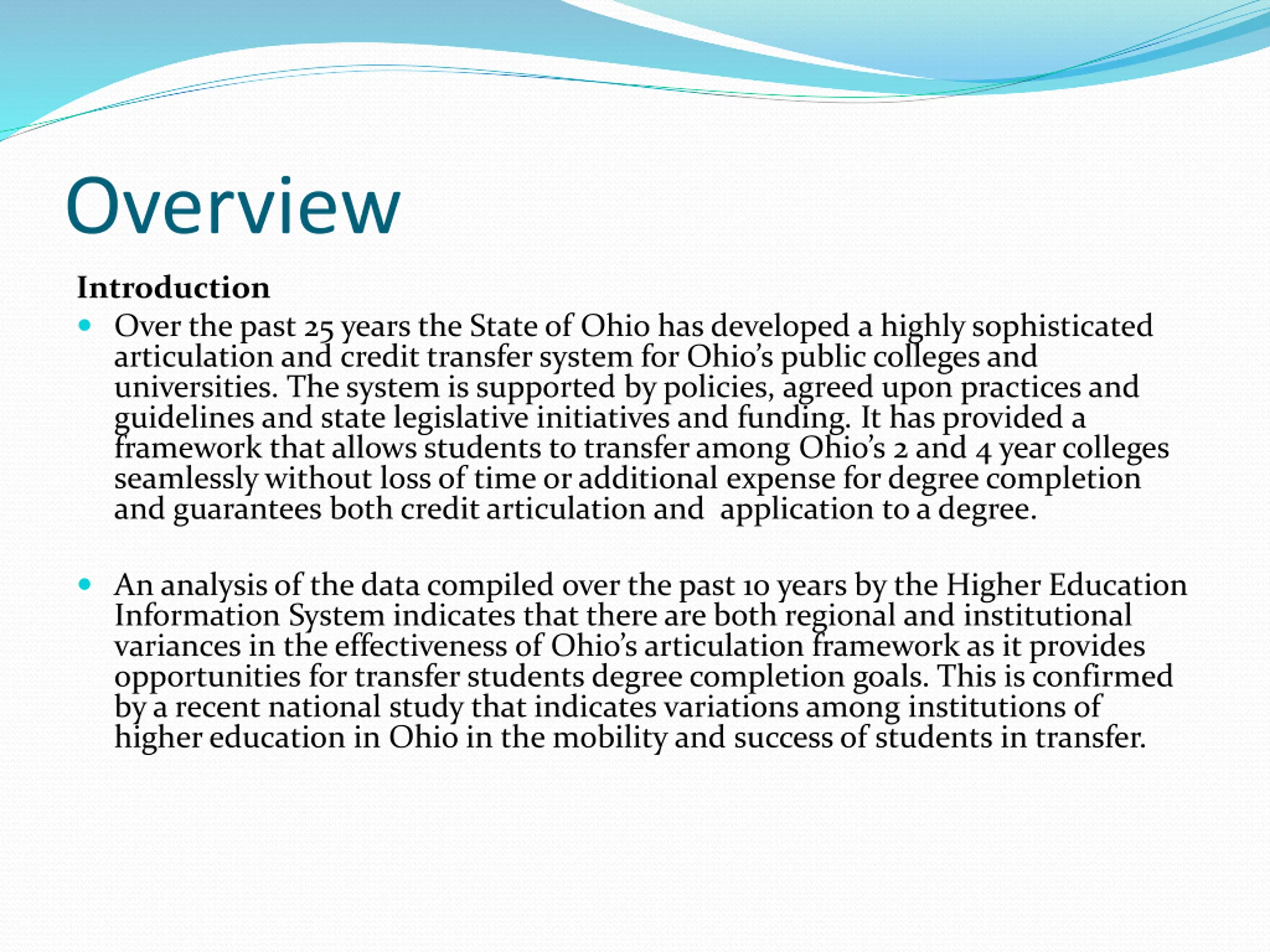 Overview Introduction Over the past 25 years the State of Ohio has developed a highly sophisticated articulation and credit transfer system for Ohio s public colleges and universities. The system is supported by policies, agreed upon practices and guidelines and state legislative initiatives and funding. It has provided a framework that allows students to transfer among Ohio s 2 and 4 year colleges seamlessly without loss of time or additional expense for degree completion and guarantees both credit articulation and application to a degree. An analysis of the data compiled over the past 10 years by the Higher Education Information System indicates that there are both regional and institutional variances in the effectiveness of Ohio s articulation framework as it provides opportunities for transfer students degree completion goals. This is confirmed by a recent national study that indicates variations among institutions of higher education in Ohio in the mobility and success of students in transfer.