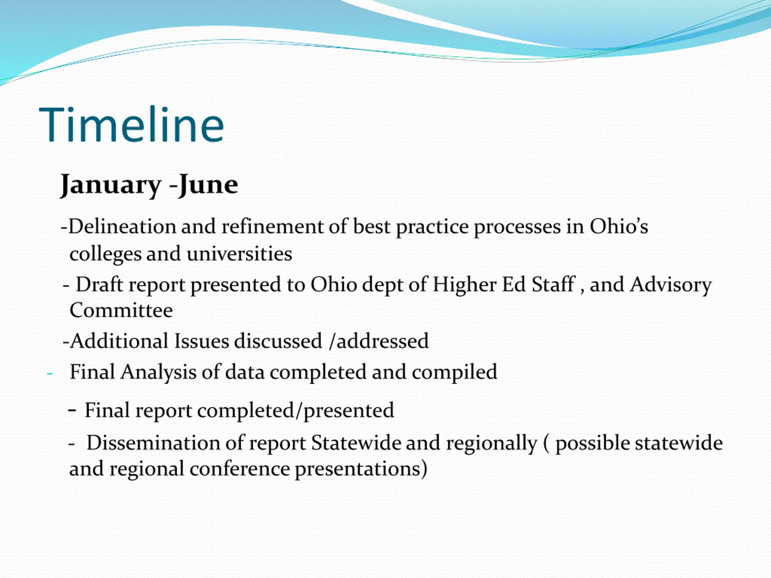 Timeline January -June -Delineation and refinement of best practice processes in Ohio s colleges and universities - Draft report presented to Ohio dept of Higher Ed Staff , and Advisory Committee -Additional Issues discussed /addressed - Final Analysis of data completed and compiled - Final report completed/presented - Dissemination of report Statewide and regionally ( possible statewide and regional conference presentations)