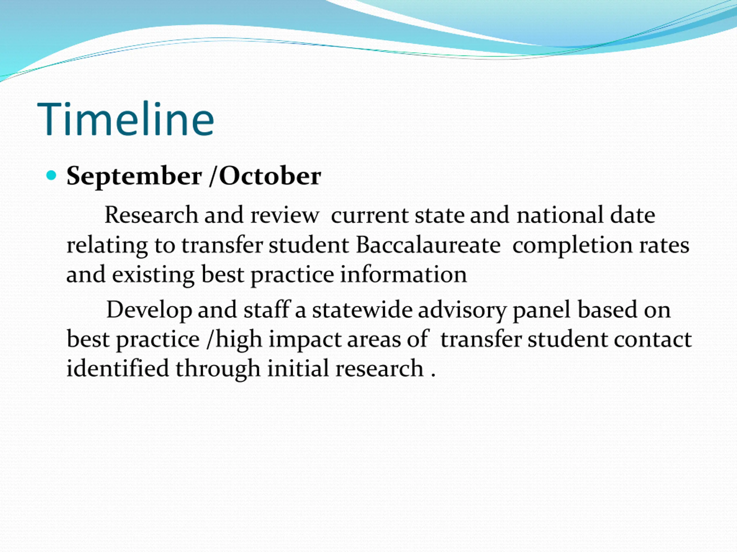 Timeline September /October Research and review current state and national date relating to transfer student Baccalaureate completion rates and existing best practice information Develop and staff a statewide advisory panel based on best practice /high impact areas of transfer student contact identified through initial research .
