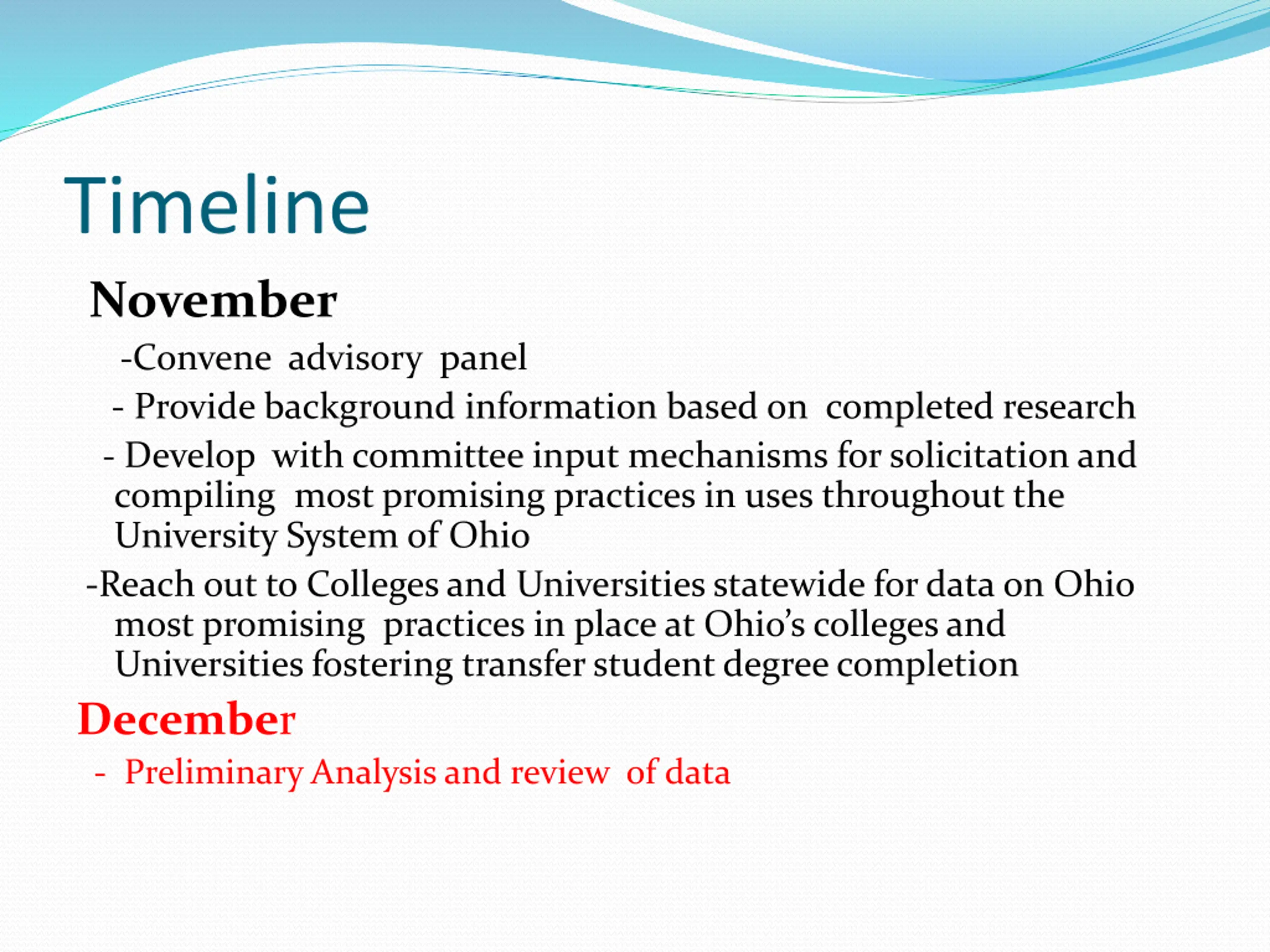 Timeline November -Convene advisory panel - Provide background information based on completed research - Develop with committee input mechanisms for solicitation and compiling most promising practices in uses throughout the University System of Ohio -Reach out to Colleges and Universities statewide for data on Ohio most promising practices in place at Ohio s colleges and Universities fostering transfer student degree completion December - Preliminary Analysis and review of data