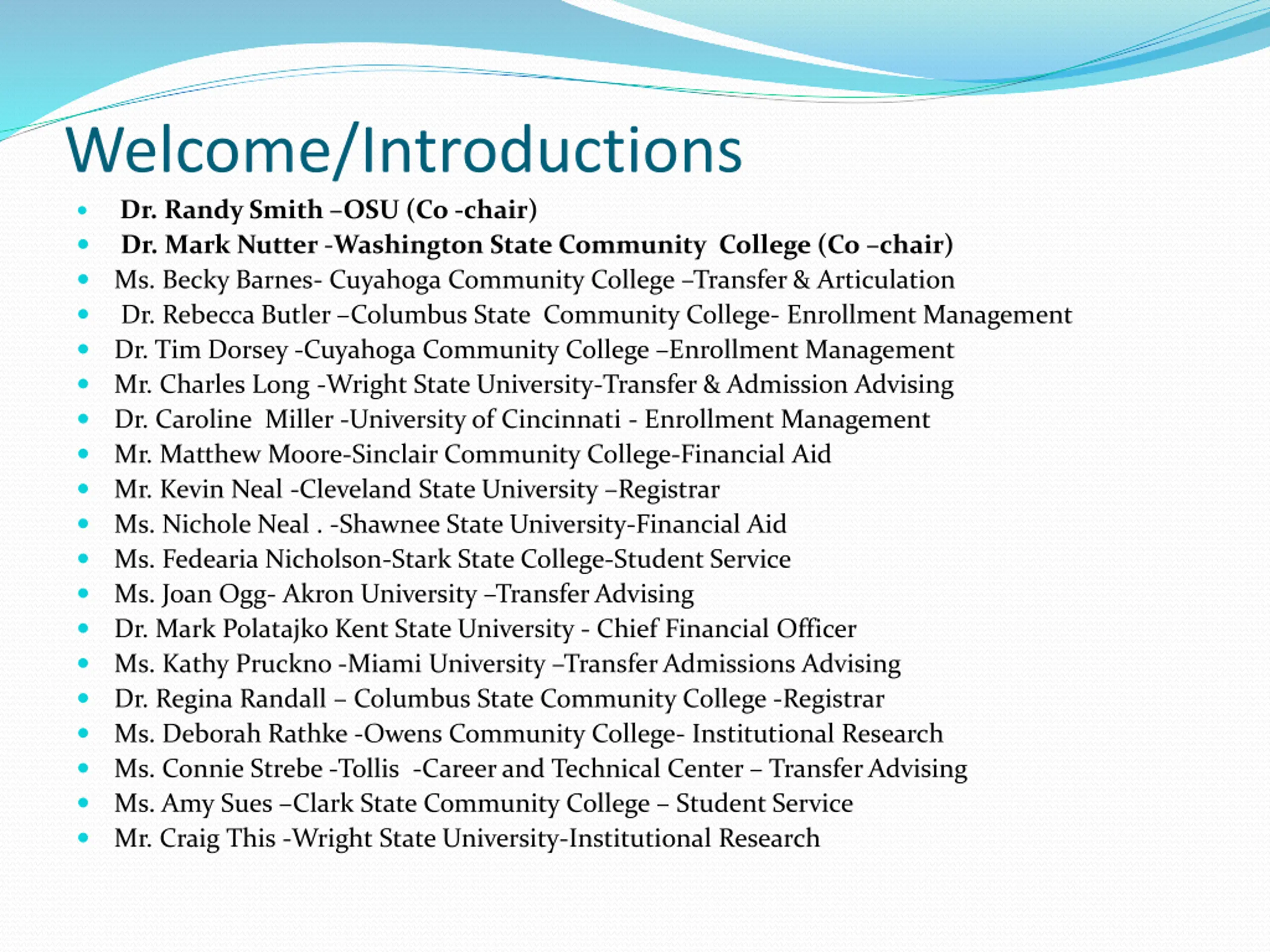 Welcome/Introductions Dr. Randy Smith OSU (Co -chair) Dr. Mark Nutter -Washington State Community College (Co chair) Ms. Becky Barnes- Cuyahoga Community College Transfer & Articulation Dr. Rebecca Butler Columbus State Community College- Enrollment Management Dr. Tim Dorsey -Cuyahoga Community College Enrollment Management Mr. Charles Long -Wright State University-Transfer & Admission Advising Dr. Caroline Miller -University of Cincinnati - Enrollment Management Mr. Matthew Moore-Sinclair Community College-Financial Aid Mr. Kevin Neal -Cleveland State University Registrar Ms. Nichole Neal . -Shawnee State University-Financial Aid Ms. Fedearia Nicholson-Stark State College-Student Service Ms. Joan Ogg- Akron University Transfer Advising Dr. Mark Polatajko Kent State University - Chief Financial Officer Ms. Kathy Pruckno -Miami University Transfer Admissions Advising Dr. Regina Randall Columbus State Community College -Registrar Ms. Deborah Rathke -Owens Community College- Institutional Research Ms. Connie Strebe -Tollis -Career and Technical Center Transfer Advising Ms. Amy Sues Clark State Community College Student Service Mr. Craig This -Wright State University-Institutional Research