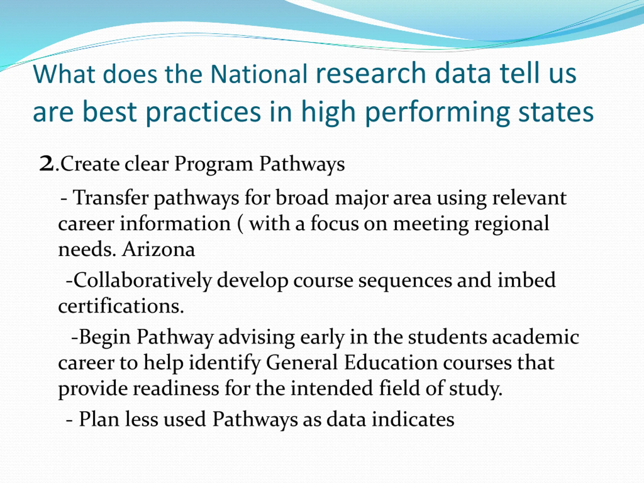 What does the National research data tell us are best practices in high performing states 2.Create clear Program Pathways - Transfer pathways for broad major area using relevant career information ( with a focus on meeting regional needs. Arizona -Collaboratively develop course sequences and imbed certifications. -Begin Pathway advising early in the students academic career to help identify General Education courses that provide readiness for the intended field of study. - Plan less used Pathways as data indicates