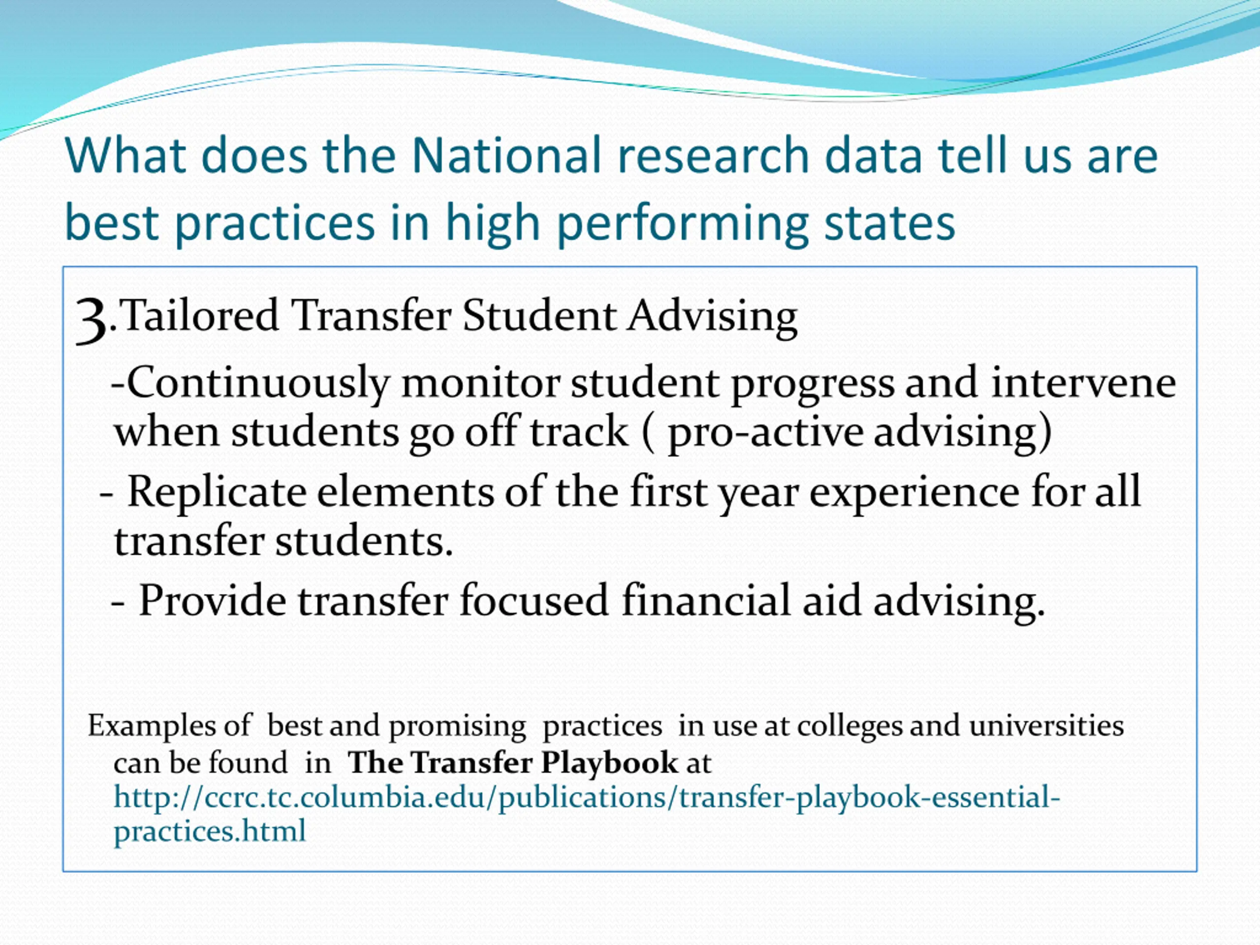 What does the National research data tell us are best practices in high performing states 3.Tailored Transfer Student Advising -Continuously monitor student progress and intervene when students go off track ( pro-active advising) - Replicate elements of the first year experience for all transfer students. - Provide transfer focused financial aid advising. Examples of best and promising practices in use at colleges and universities can be found in The Transfer Playbook at http://ccrc.tc.columbia.edu/publications/transfer-playbook-essential- practices.html
