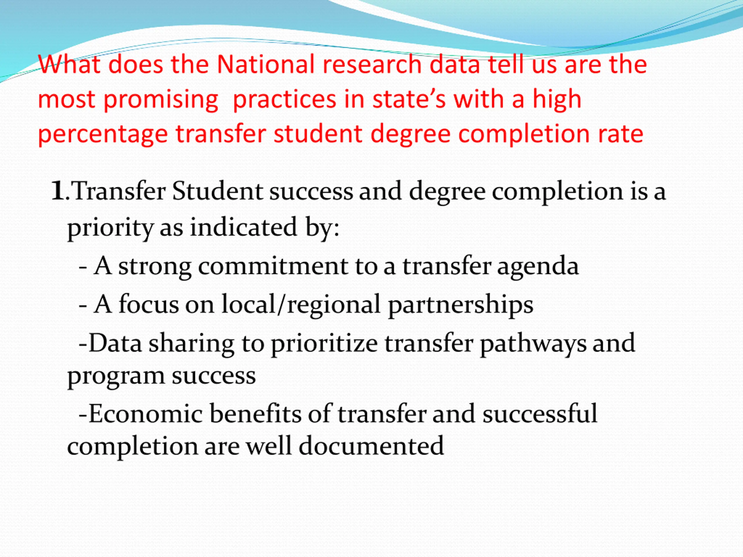 What does the National research data tell us are the most promising practices in state s with a high percentage transfer student degree completion rate 1.Transfer Student success and degree completion is a priority as indicated by: - A strong commitment to a transfer agenda - A focus on local/regional partnerships -Data sharing to prioritize transfer pathways and program success -Economic benefits of transfer and successful completion are well documented
