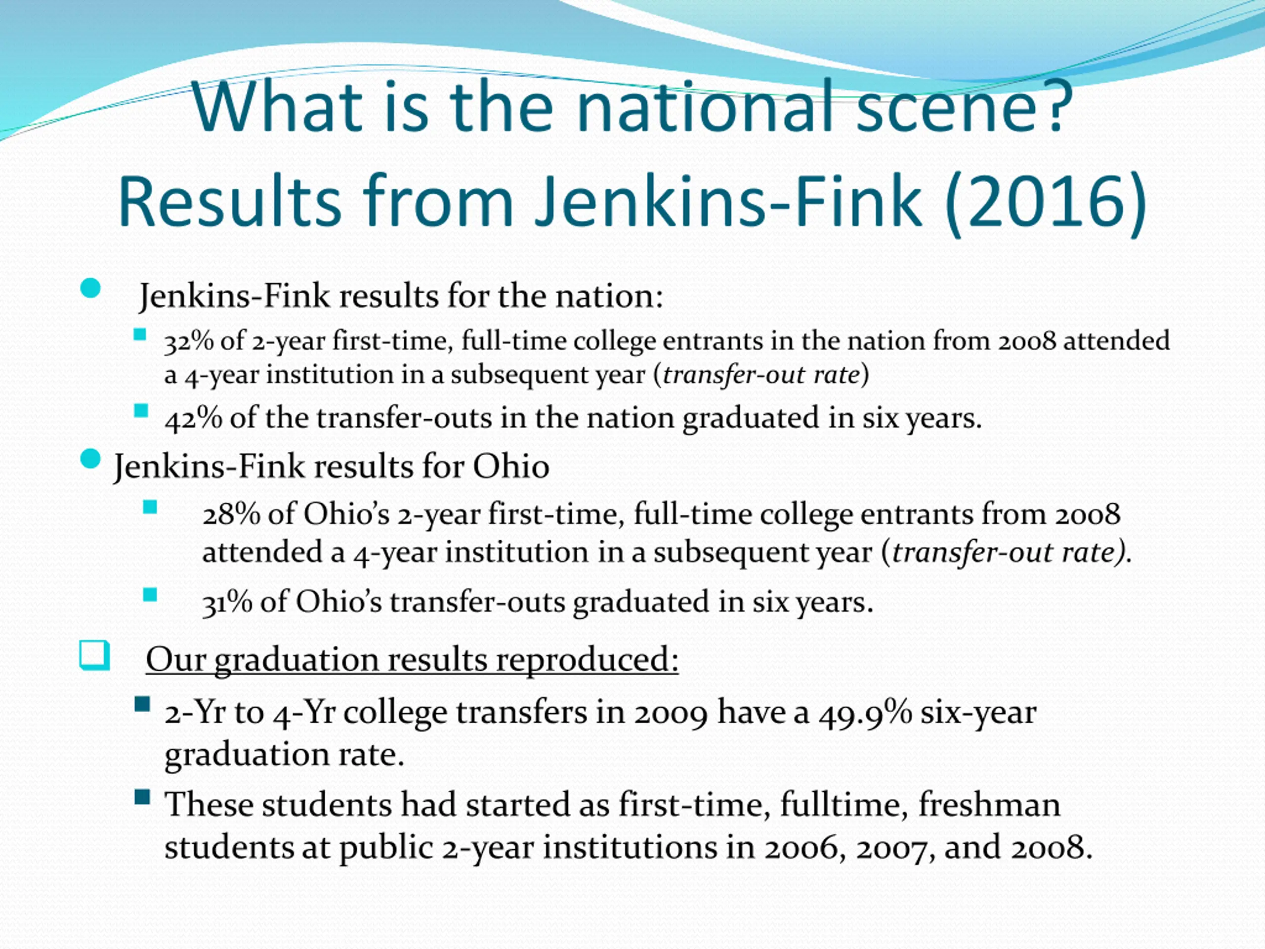 What is the national scene? Results from Jenkins-Fink (2016) Jenkins-Fink results for the nation: 32% of 2-year first-time, full-time college entrants in the nation from 2008 attended a 4-year institution in a subsequent year (transfer-out rate) 42% of the transfer-outs in the nation graduated in six years. Jenkins-Fink results for Ohio 28% of Ohio s 2-year first-time, full-time college entrants from 2008 attended a 4-year institution in a subsequent year (transfer-out rate). 31% of Ohio s transfer-outs graduated in six years. Our graduation results reproduced: 2-Yr to 4-Yr college transfers in 2009 have a 49.9% six-year graduation rate. These students had started as first-time, fulltime, freshman students at public 2-year institutions in 2006, 2007, and 2008.