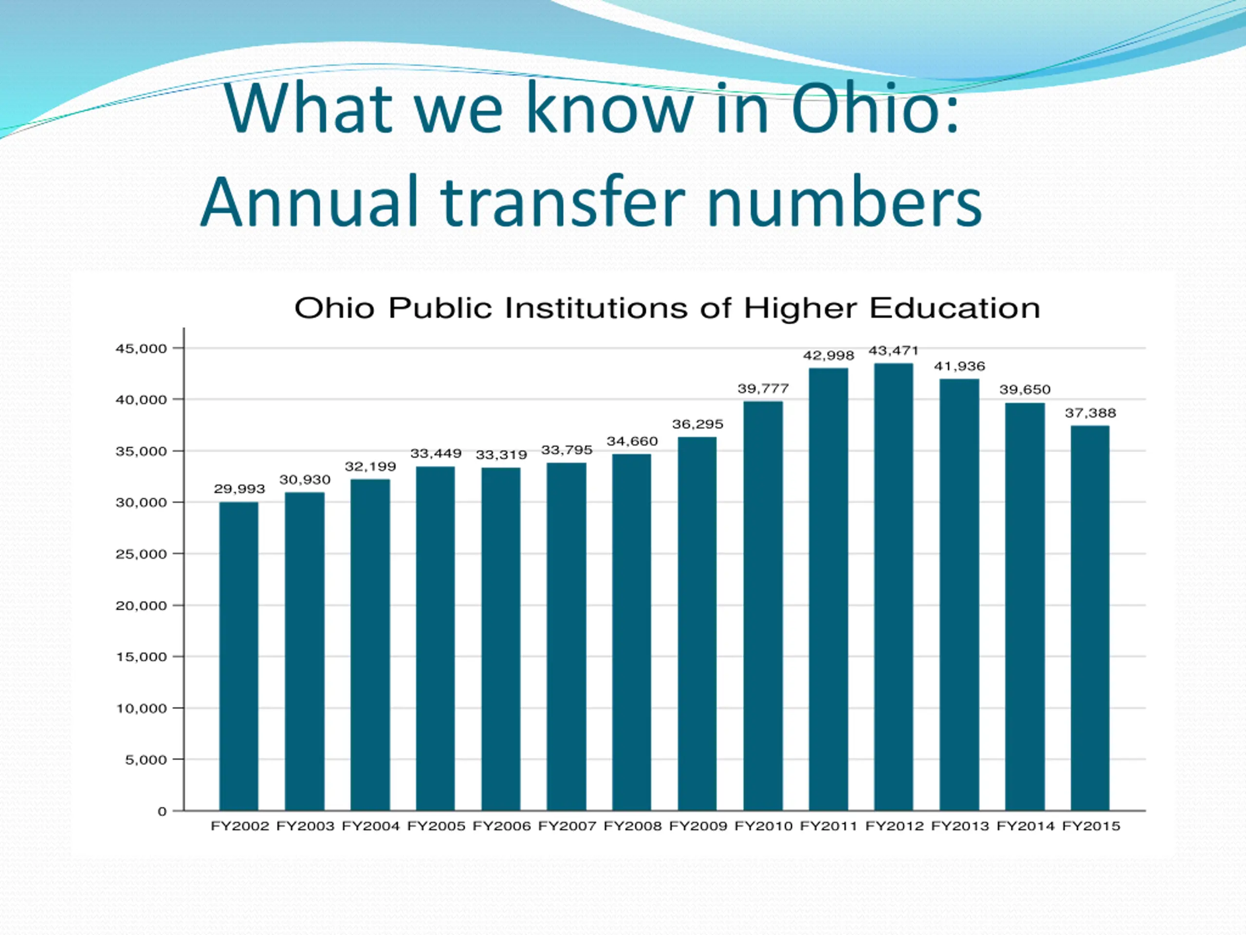 What we know in Ohio: Annual transfer numbers Ohio Public Institutions of Higher Education 45,000 43,471 42,998 41,936 39,777 39,650 40,000 37,388 36,295 34,660 33,795 35,000 33,449 33,319 32,199 30,930 29,993 30,000 25,000 20,000 15,000 10,000 5,000 0 FY2002 FY2003 FY2004 FY2005 FY2006 FY2007 FY2008 FY2009 FY2010 FY2011 FY2012 FY2013 FY2014 FY2015