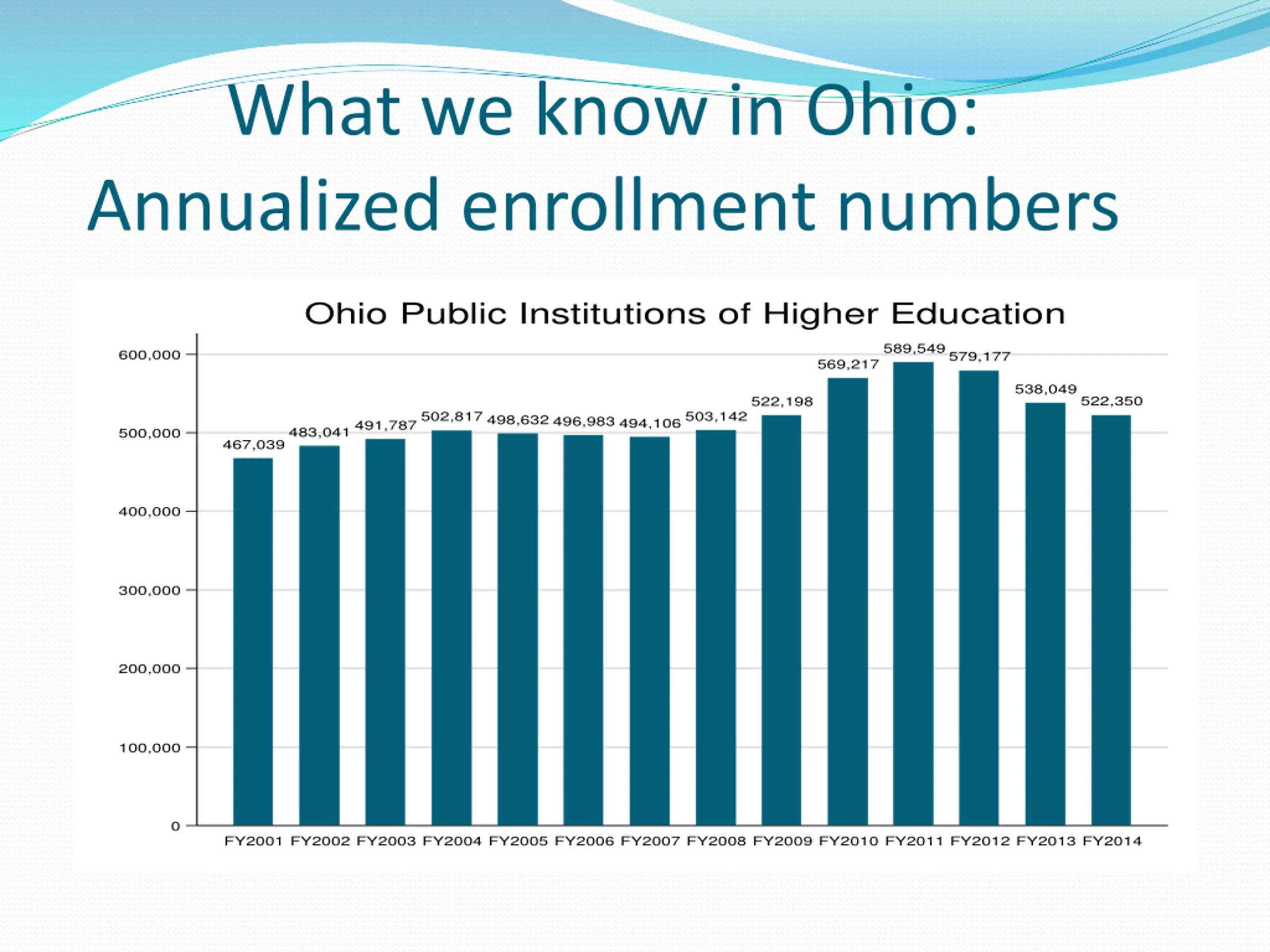What we know in Ohio: Annualized enrollment numbers Ohio Public Institutions of Higher Education 589,549579,177 600,000 569,217 538,049522,350 522,198 467,039483,041491,787502,817498,632496,983494,106503,142 500,000 400,000 300,000 200,000 100,000 0 FY2001 FY2002 FY2003 FY2004 FY2005 FY2006 FY2007 FY2008 FY2009 FY2010 FY2011 FY2012 FY2013 FY2014