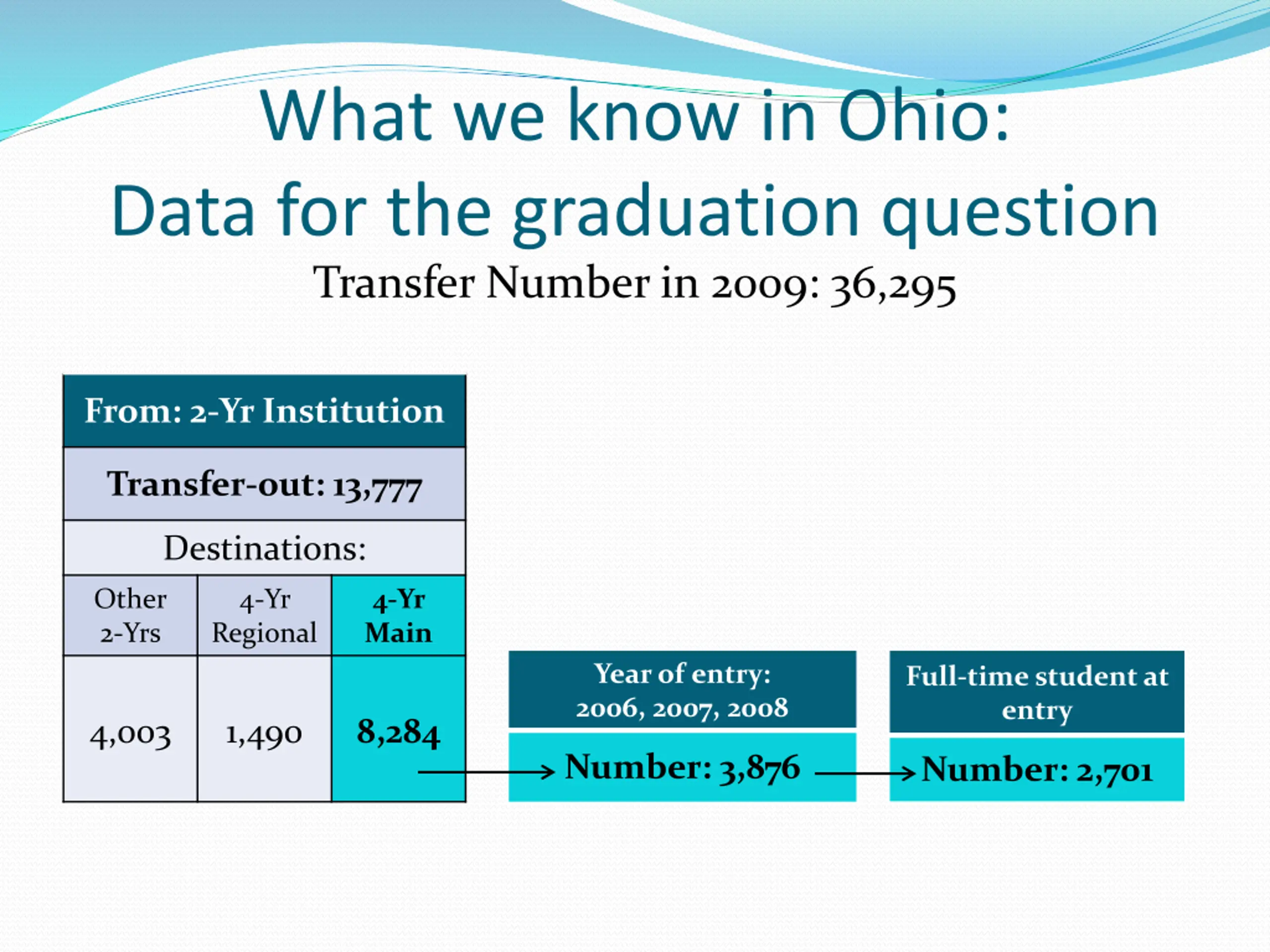 What we know in Ohio: Data for the graduation question Transfer Number in 2009: 36,295 From: 2-Yr Institution Transfer-out: 13,777 Destinations: Other 2-Yrs 4-Yr Regional 4-Yr Main Year of entry: 2006, 2007, 2008 Full-time student at entry 4,003 1,490 8,284 Number: 3,876 Number: 2,701