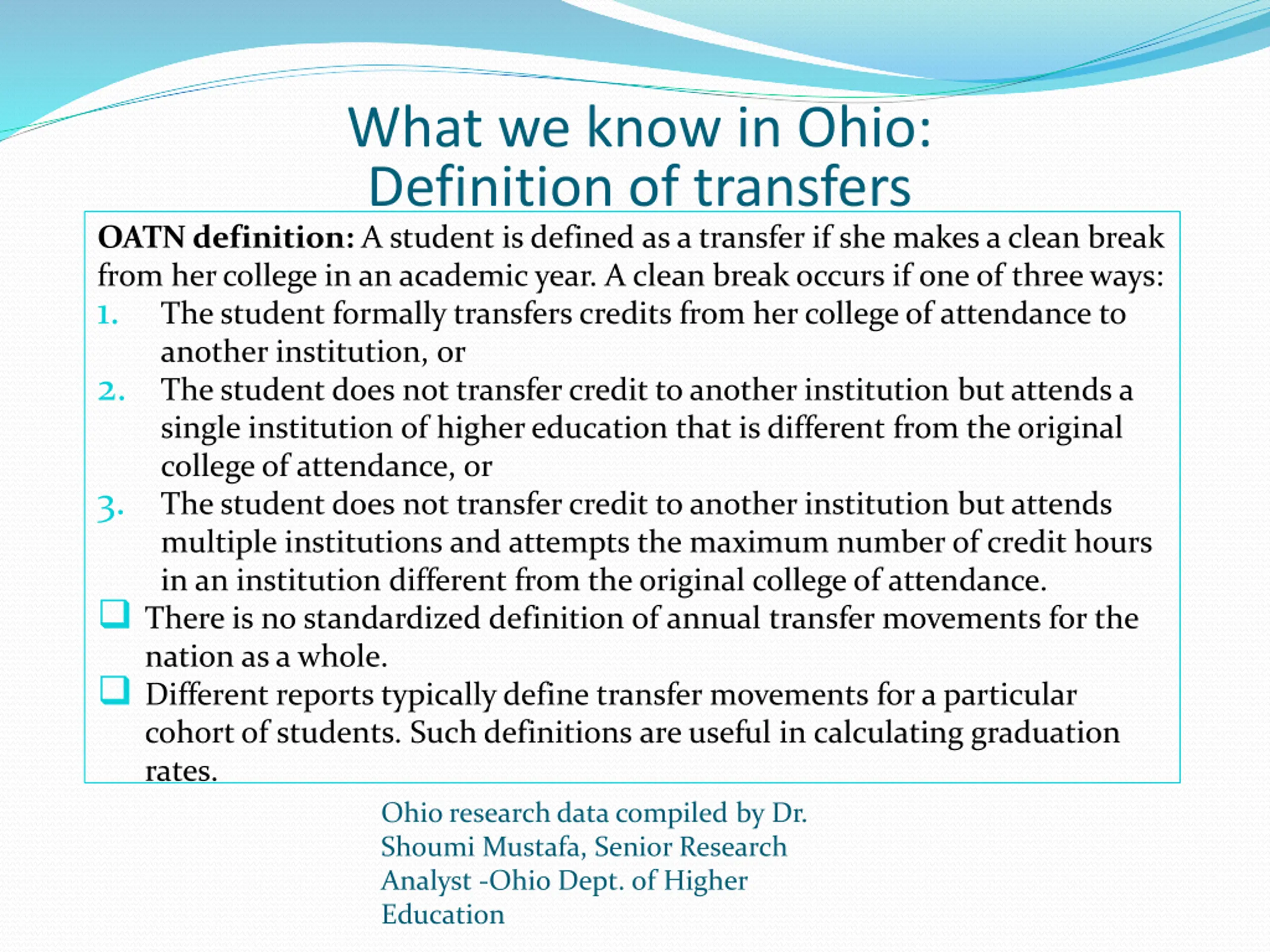 What we know in Ohio: Definition of transfers OATN definition: A student is defined as a transfer if she makes a clean break from her college in an academic year. A clean break occurs if one of three ways: 1. The student formally transfers credits from her college of attendance to another institution, or 2. The student does not transfer credit to another institution but attends a single institution of higher education that is different from the original college of attendance, or 3. The student does not transfer credit to another institution but attends multiple institutions and attempts the maximum number of credit hours in an institution different from the original college of attendance. There is no standardized definition of annual transfer movements for the nation as a whole. Different reports typically define transfer movements for a particular cohort of students. Such definitions are useful in calculating graduation rates. Ohio research data compiled by Dr. Shoumi Mustafa, Senior Research Analyst -Ohio Dept. of Higher Education