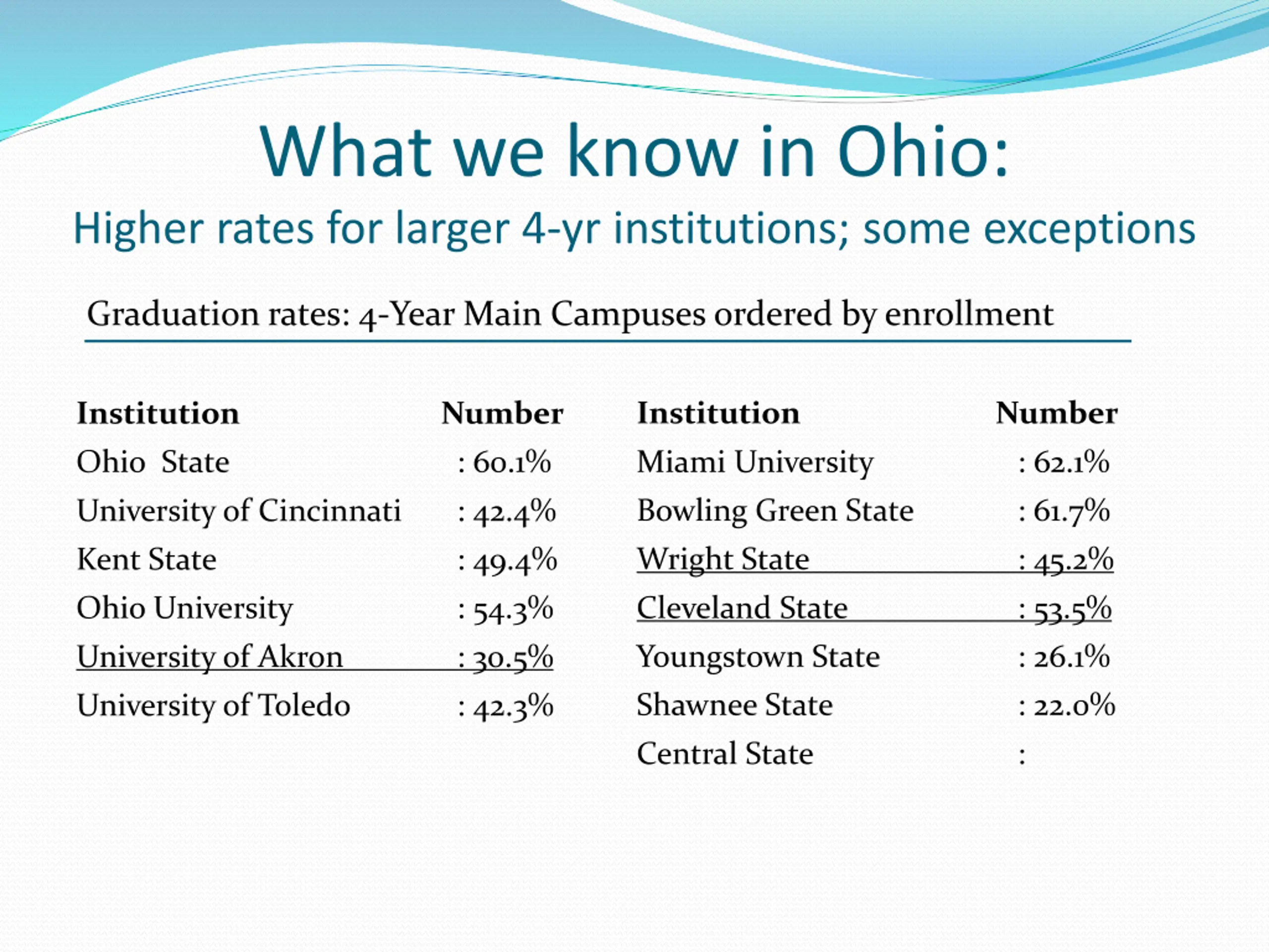 What we know in Ohio: Higher rates for larger 4-yr institutions; some exceptions Graduation rates: 4-Year Main Campuses ordered by enrollment Institution Number Institution Number Miami University : 62.1% Ohio State : 60.1% Bowling Green State : 61.7% University of Cincinnati : 42.4% Wright State : 45.2% Kent State : 49.4% Cleveland State : 53.5% Ohio University : 54.3% Youngstown State : 26.1% University of Akron : 30.5% Shawnee State : 22.0% University of Toledo : 42.3% Central State :