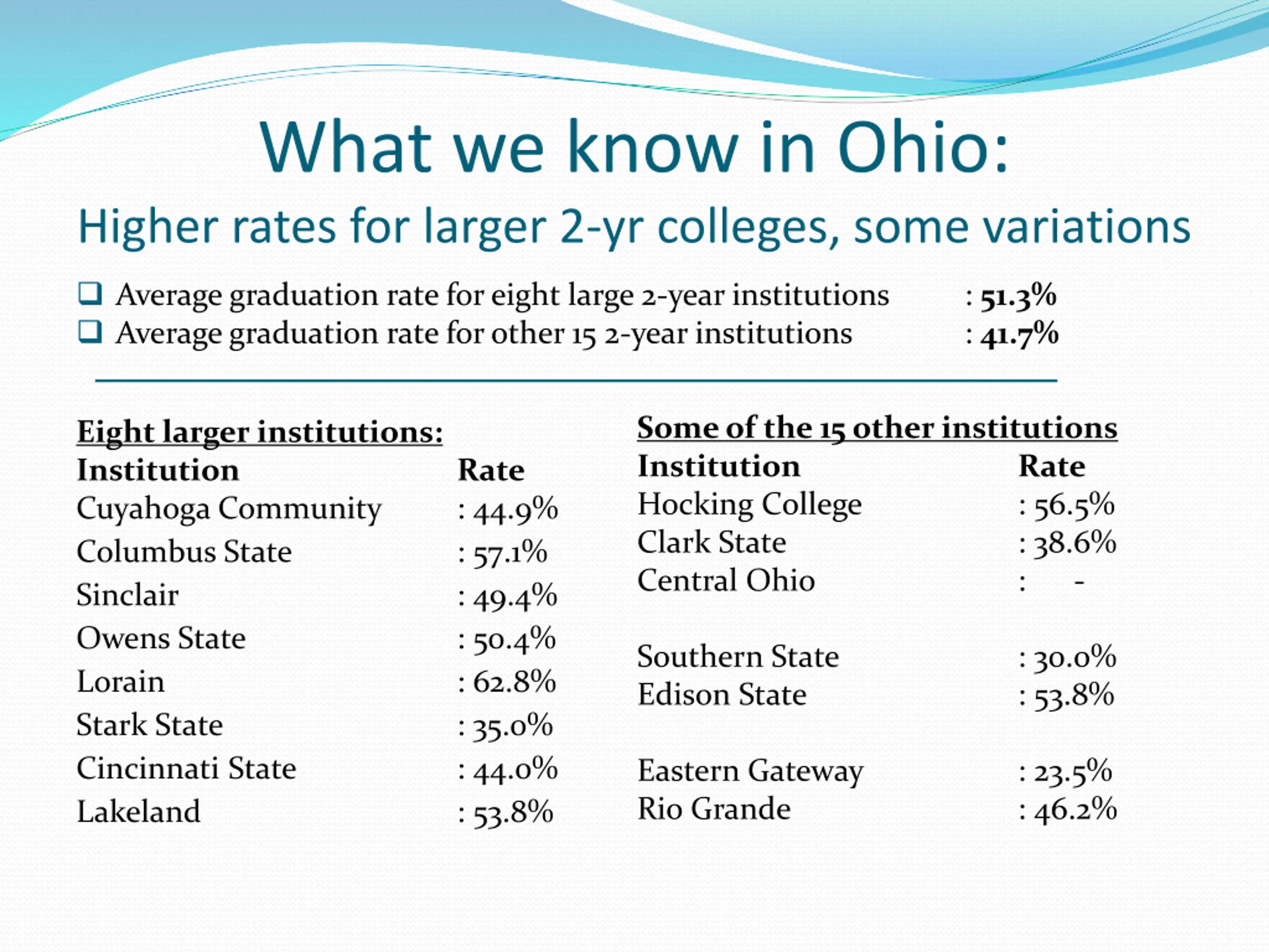 What we know in Ohio: Higher rates for larger 2-yr colleges, some variations Average graduation rate for eight large 2-year institutions Average graduation rate for other 15 2-year institutions : 51.3% : 41.7% Some of the 15 other institutions Institution Hocking College Clark State Central Ohio Eight larger institutions: Institution Cuyahoga Community Columbus State Sinclair Owens State Lorain Stark State Cincinnati State Lakeland Rate : 56.5% : 38.6% : - Rate : 44.9% : 57.1% : 49.4% : 50.4% : 62.8% : 35.0% : 44.0% : 53.8% Southern State Edison State : 30.0% : 53.8% Eastern Gateway Rio Grande : 23.5% : 46.2%