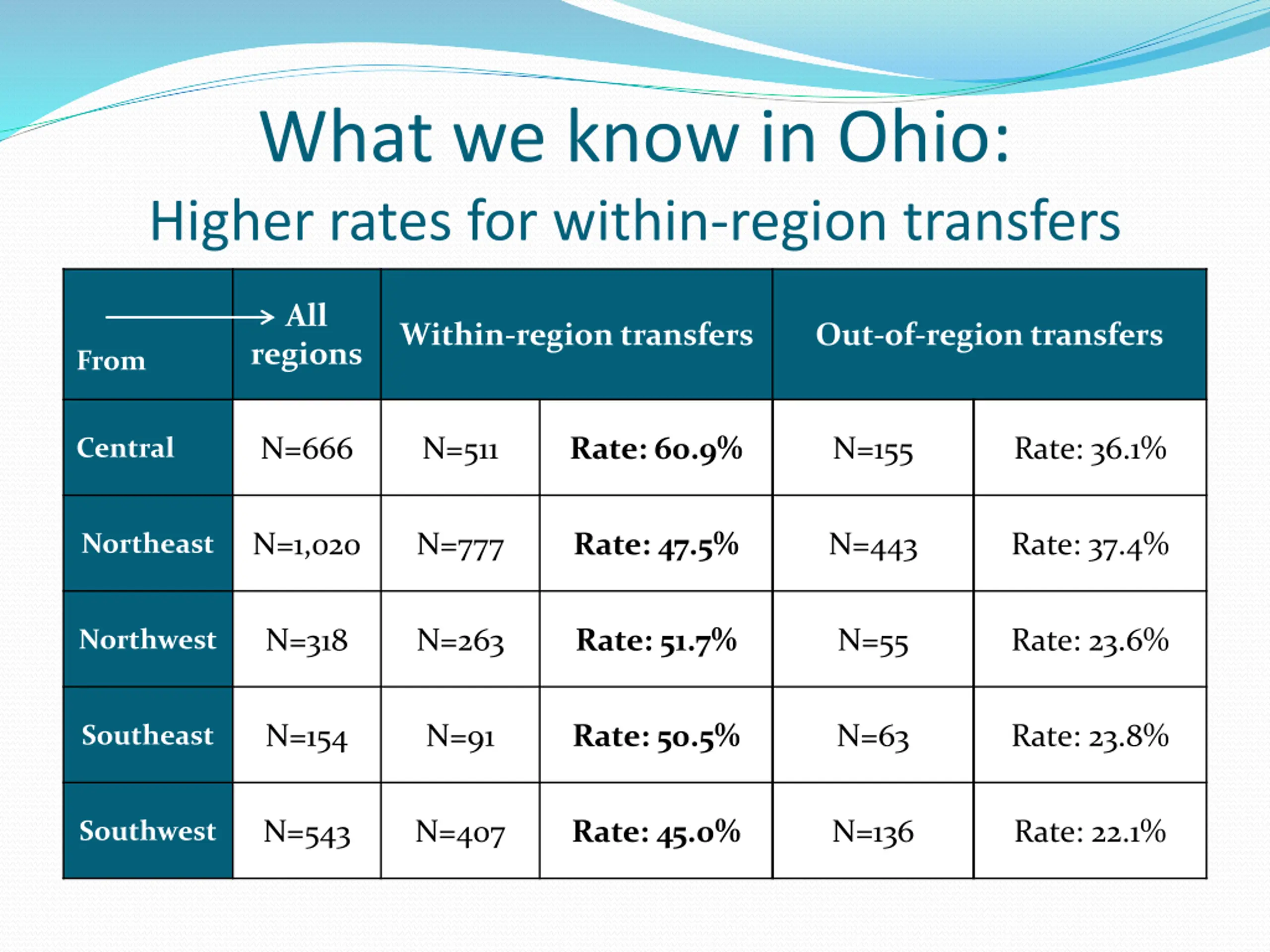What we know in Ohio: Higher rates for within-region transfers All Within-region transfers Out-of-region transfers regions From N=666 N=511 Rate: 60.9% N=155 Rate: 36.1% Central N=1,020 N=777 Rate: 47.5% N=443 Rate: 37.4% Northeast N=318 N=263 Rate: 51.7% N=55 Rate: 23.6% Northwest N=154 N=91 Rate: 50.5% N=63 Rate: 23.8% Southeast N=543 N=407 Rate: 45.0% N=136 Rate: 22.1% Southwest