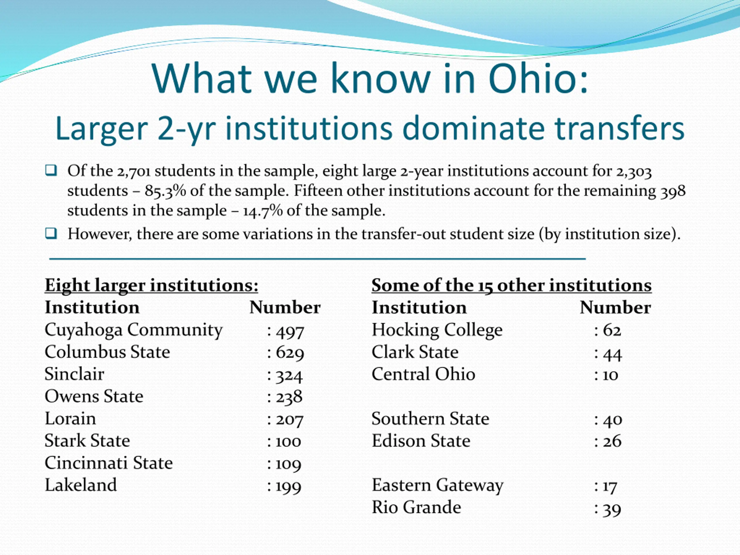 What we know in Ohio: Larger 2-yr institutions dominate transfers Of the 2,701 students in the sample, eight large 2-year institutions account for 2,303 students 85.3% of the sample. Fifteen other institutions account for the remaining 398 students in the sample 14.7% of the sample. However, there are some variations in the transfer-out student size (by institution size). Eight larger institutions: Institution Cuyahoga Community Columbus State Sinclair Owens State Lorain Stark State Cincinnati State Lakeland Some of the 15 other institutions Institution Hocking College Clark State Central Ohio Number Number : 497 : 629 : 324 : 238 : 207 : 100 : 109 : 199 : 62 : 44 : 10 Southern State Edison State : 40 : 26 Eastern Gateway Rio Grande : 17 : 39