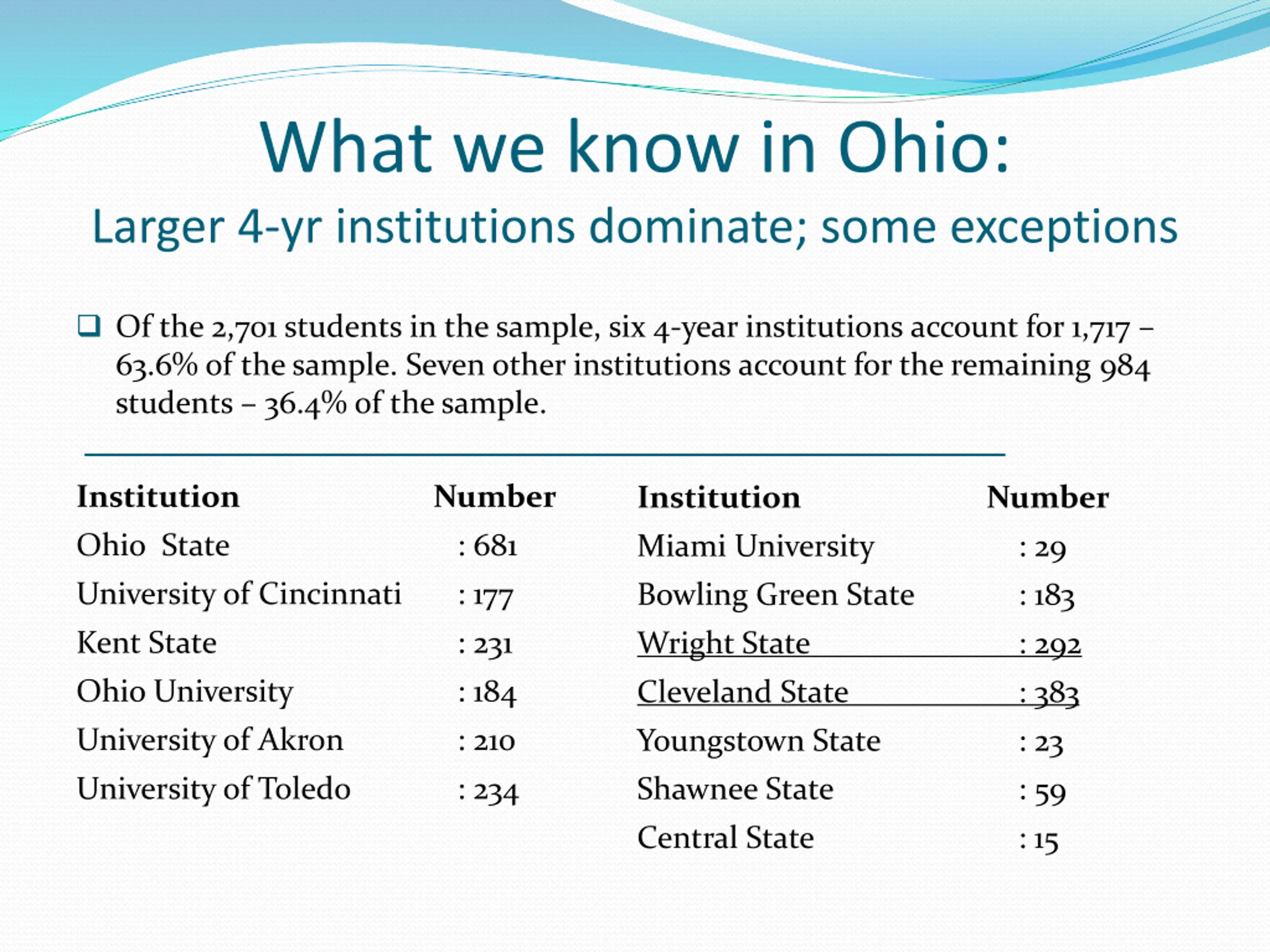 What we know in Ohio: Larger 4-yr institutions dominate; some exceptions Of the 2,701 students in the sample, six 4-year institutions account for 1,717 63.6% of the sample. Seven other institutions account for the remaining 984 students 36.4% of the sample. Institution Number Institution Number Ohio State : 681 Miami University : 29 University of Cincinnati : 177 Bowling Green State : 183 Kent State : 231 Wright State : 292 Ohio University : 184 Cleveland State : 383 University of Akron : 210 Youngstown State : 23 University of Toledo : 234 Shawnee State : 59 Central State : 15