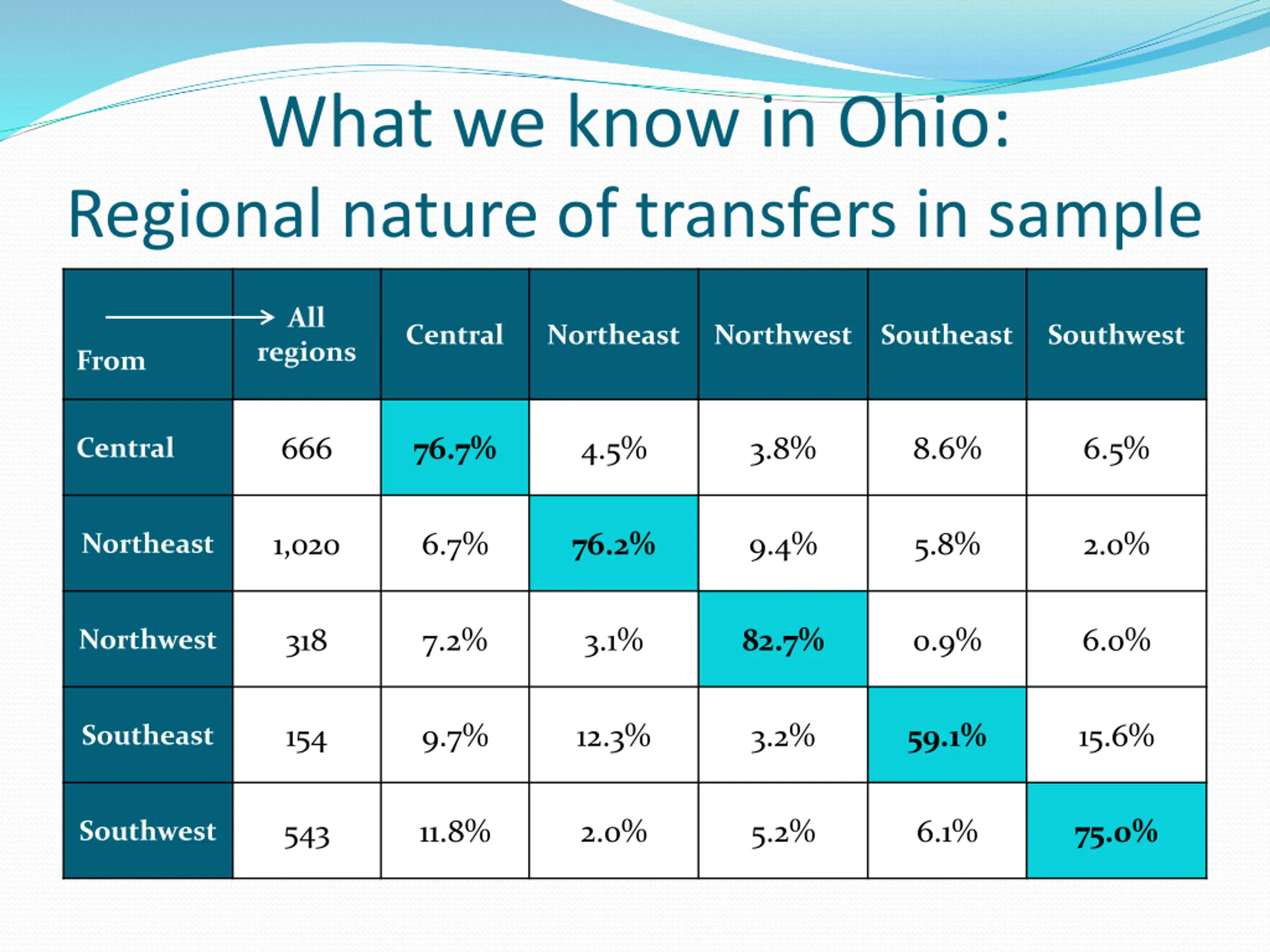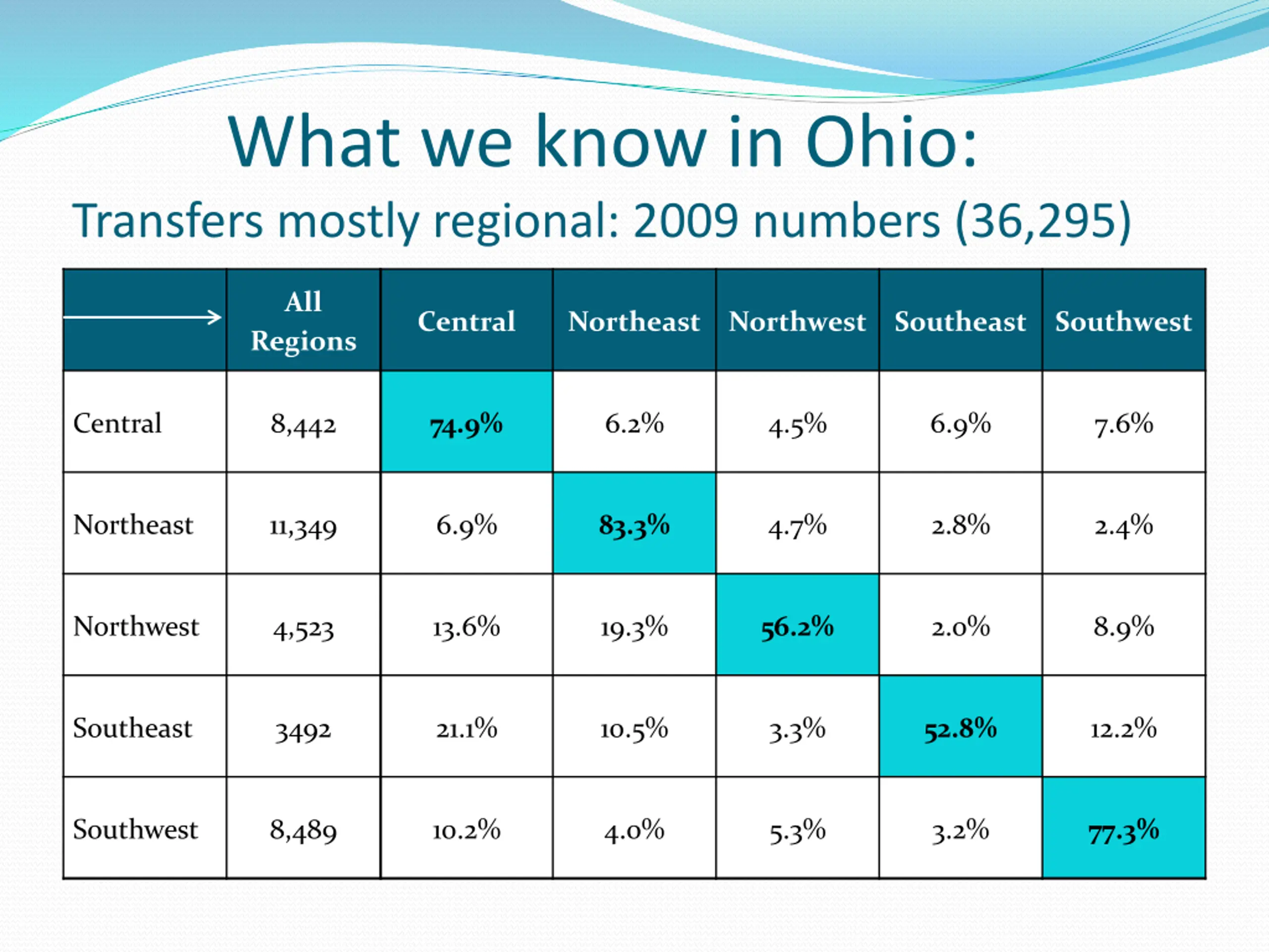 What we know in Ohio: Transfers mostly regional: 2009 numbers (36,295) All Central Northeast Northwest Southeast Southwest Regions Central 8,442 74.9% 6.2% 4.5% 6.9% 7.6% Northeast 11,349 6.9% 83.3% 4.7% 2.8% 2.4% Northwest 4,523 13.6% 19.3% 56.2% 2.0% 8.9% Southeast 3492 21.1% 10.5% 3.3% 52.8% 12.2% Southwest 8,489 10.2% 4.0% 5.3% 3.2% 77.3%