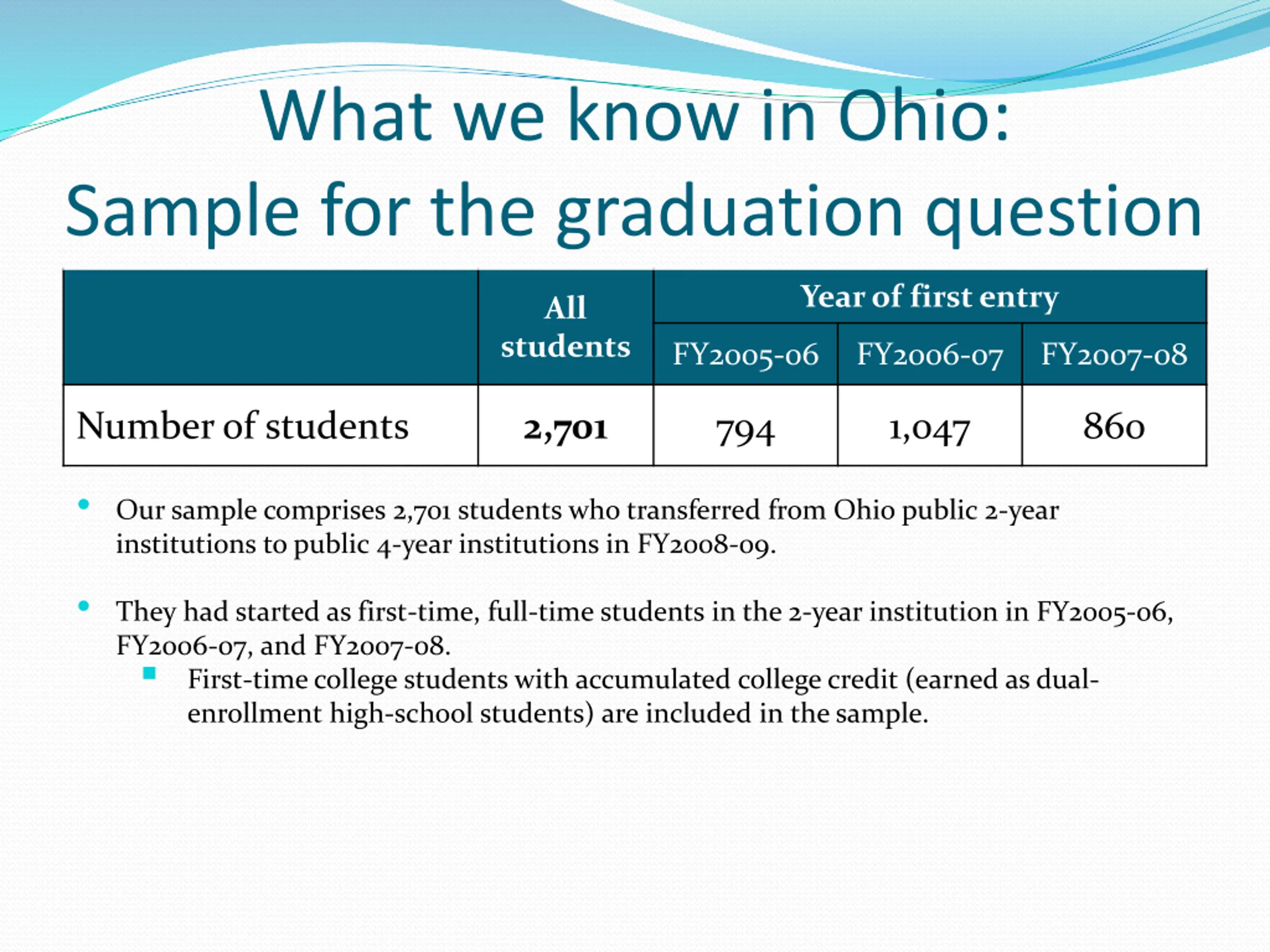 What we know in Ohio: Sample for the graduation question Year of first entry All students FY2005-06 FY2006-07 FY2007-08 Number of students 2,701 794 1,047 860 Our sample comprises 2,701 students who transferred from Ohio public 2-year institutions to public 4-year institutions in FY2008-09. They had started as first-time, full-time students in the 2-year institution in FY2005-06, FY2006-07, and FY2007-08. First-time college students with accumulated college credit (earned as dual- enrollment high-school students) are included in the sample.