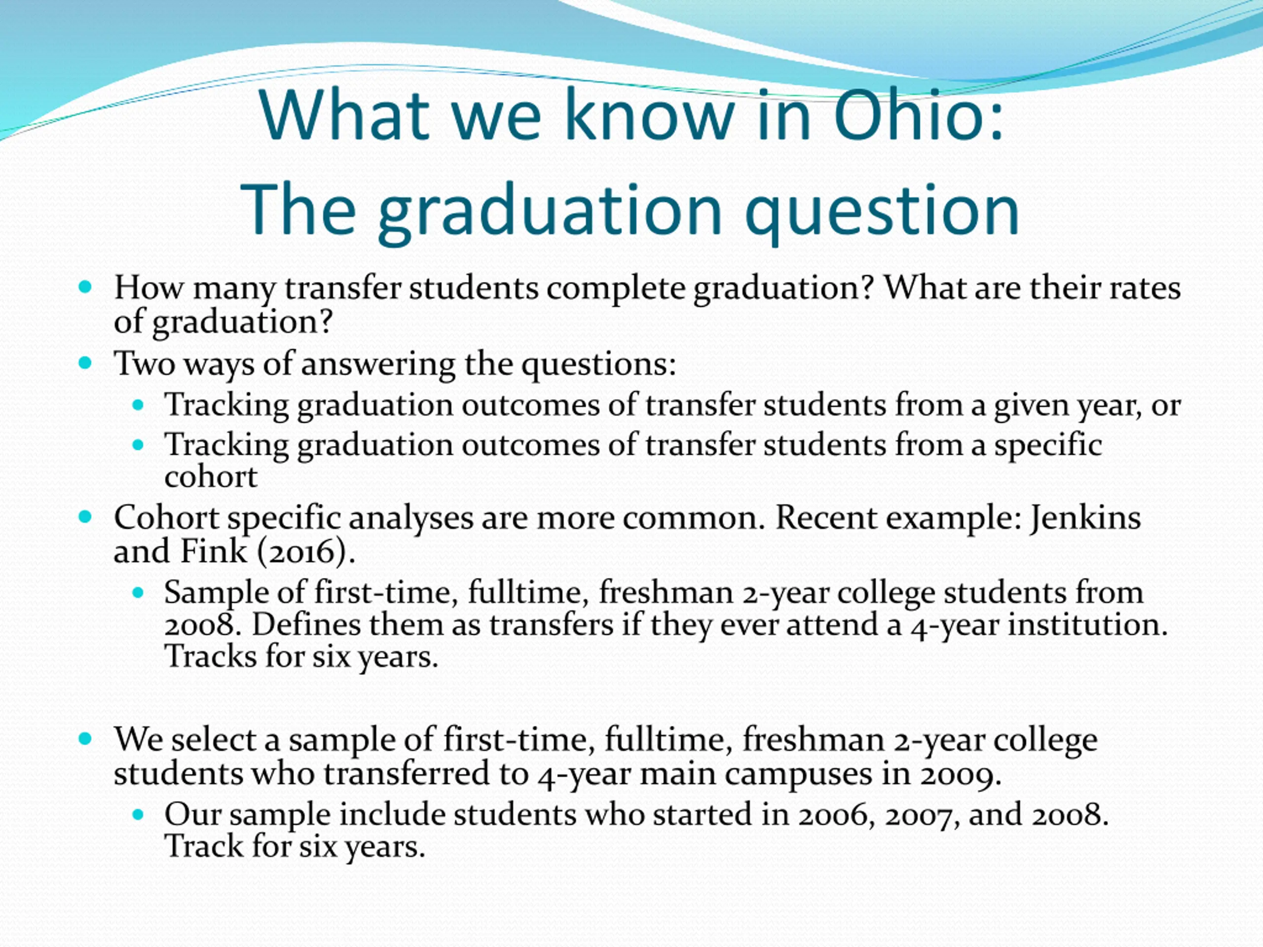 What we know in Ohio: The graduation question How many transfer students complete graduation? What are their rates of graduation? Two ways of answering the questions: Tracking graduation outcomes of transfer students from a given year, or Tracking graduation outcomes of transfer students from a specific cohort Cohort specific analyses are more common. Recent example: Jenkins and Fink (2016). Sample of first-time, fulltime, freshman 2-year college students from 2008. Defines them as transfers if they ever attend a 4-year institution. Tracks for six years. We select a sample of first-time, fulltime, freshman 2-year college students who transferred to 4-year main campuses in 2009. Our sample include students who started in 2006, 2007, and 2008. Track for six years.