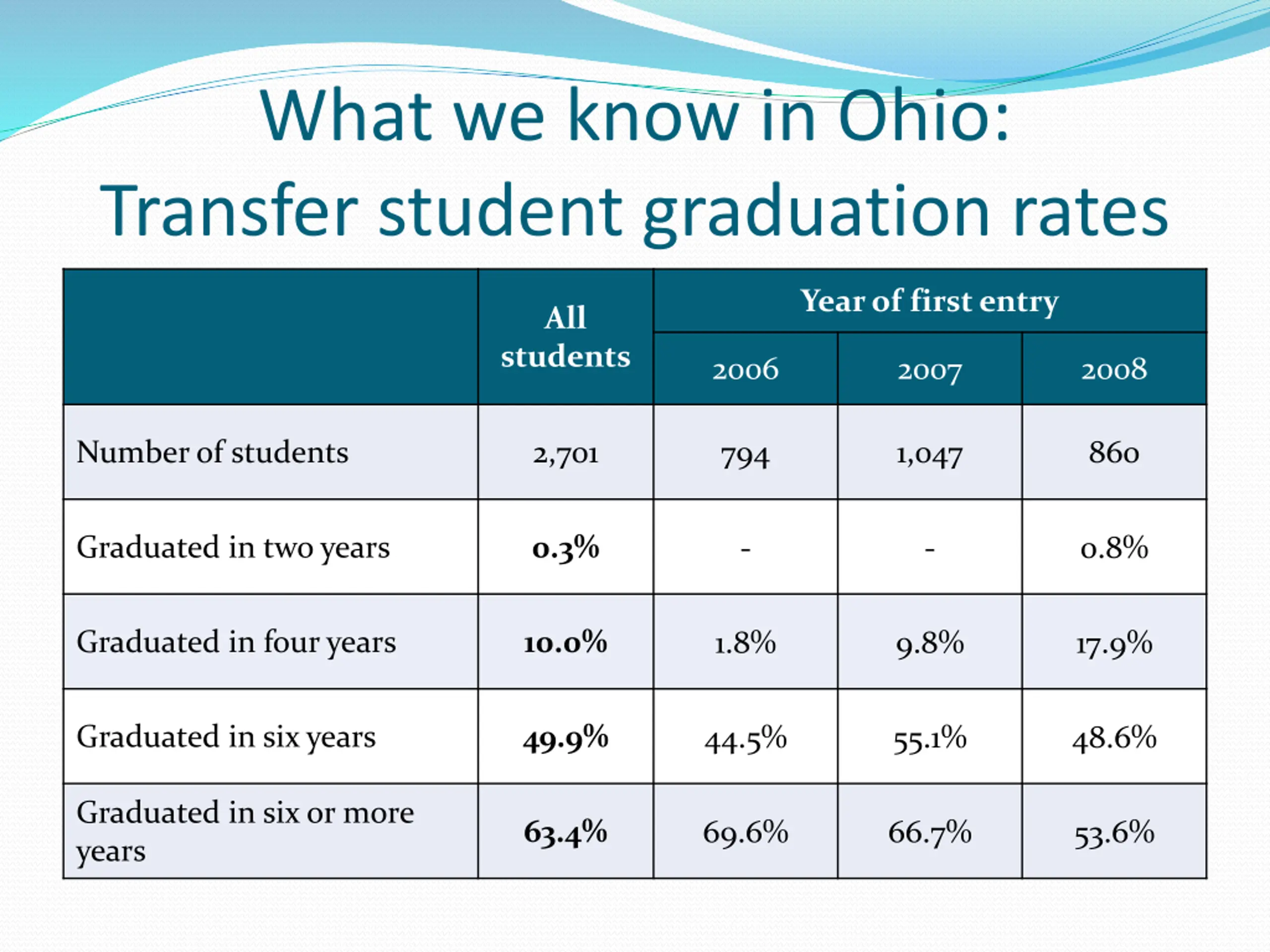 What we know in Ohio: Transfer student graduation rates Year of first entry All students 2006 2007 2008 Number of students 2,701 794 1,047 860 Graduated in two years 0.3% - - 0.8% Graduated in four years 10.0% 1.8% 9.8% 17.9% Graduated in six years 49.9% 44.5% 55.1% 48.6% Graduated in six or more years 63.4% 69.6% 66.7% 53.6%